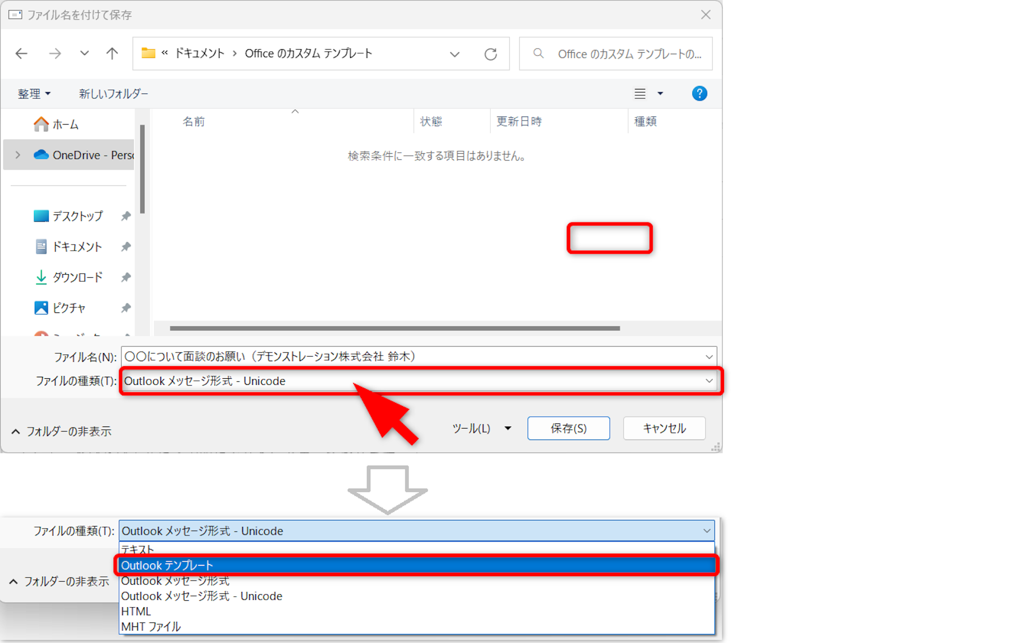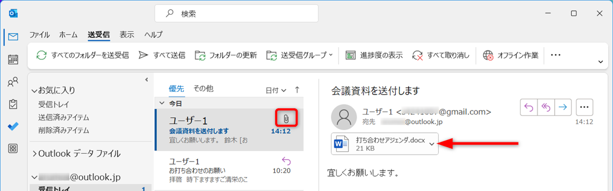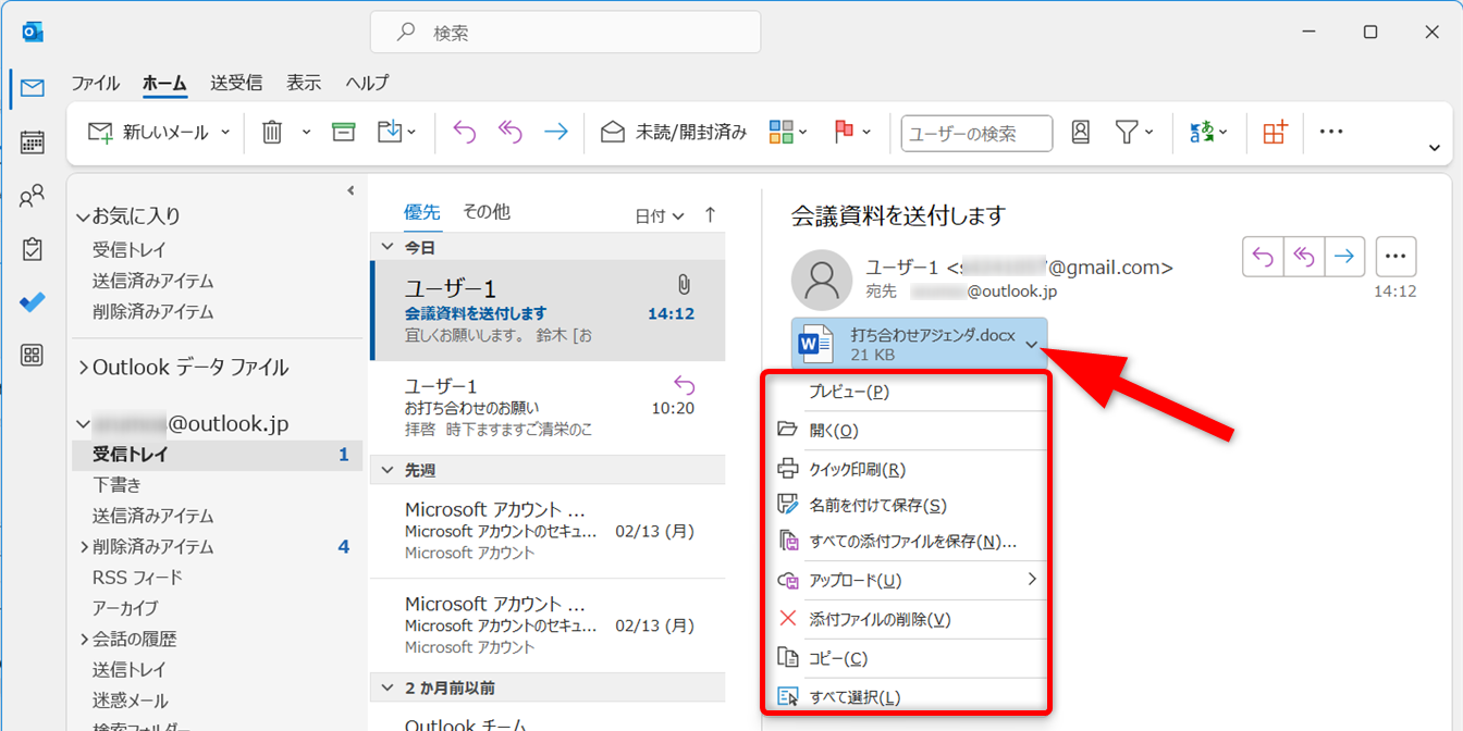 メール本文にある添付ファイル名の右側にある[下向き矢印]をクリックします。