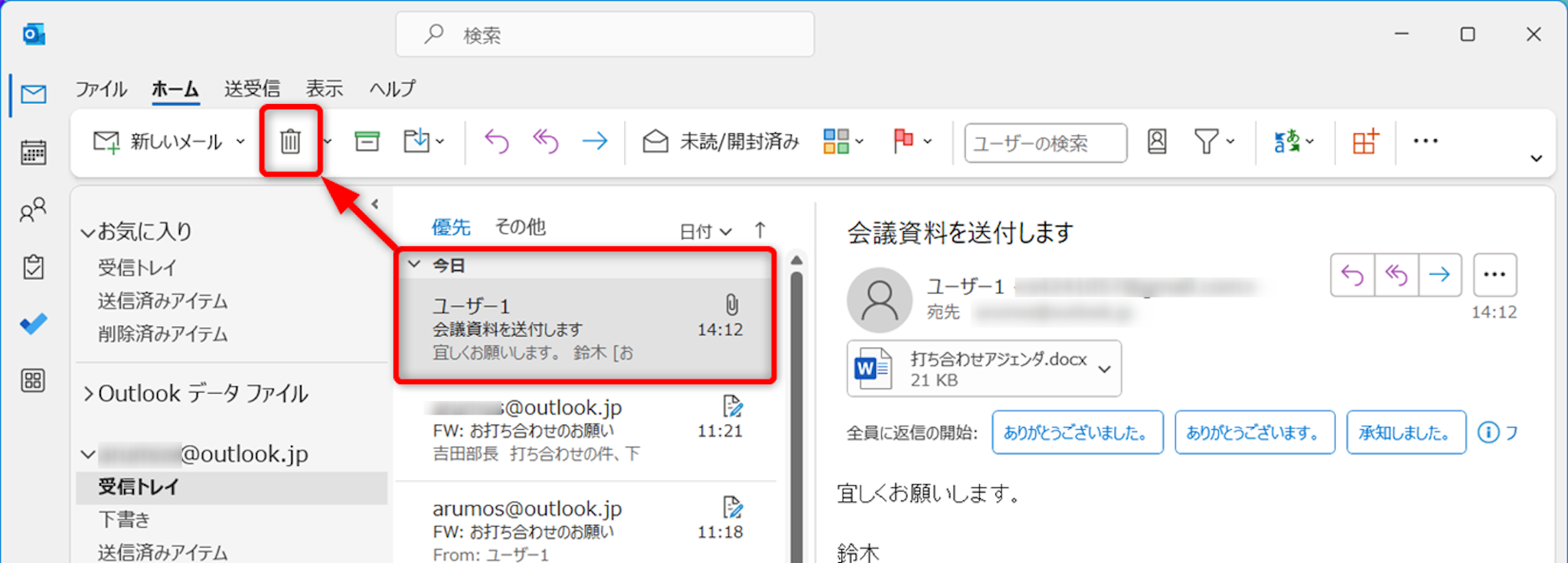削除したいメールを選択し、ゴミ箱マーク[削除]をクリックします。