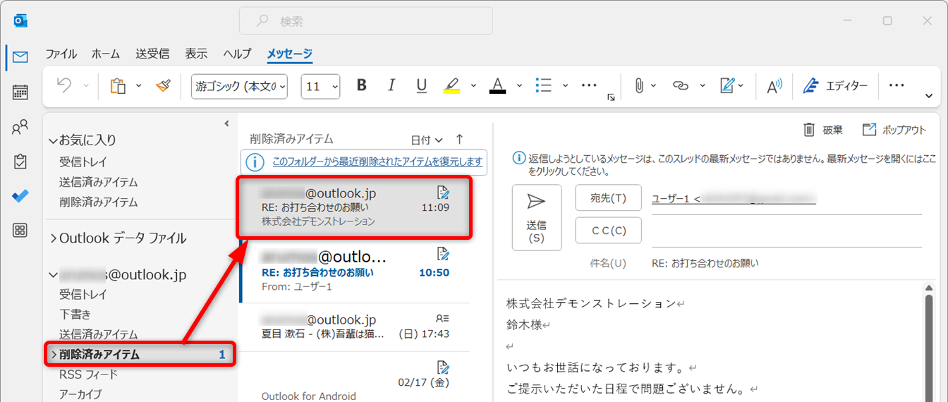 [削除済みアイテム]フォルダーを開きます。