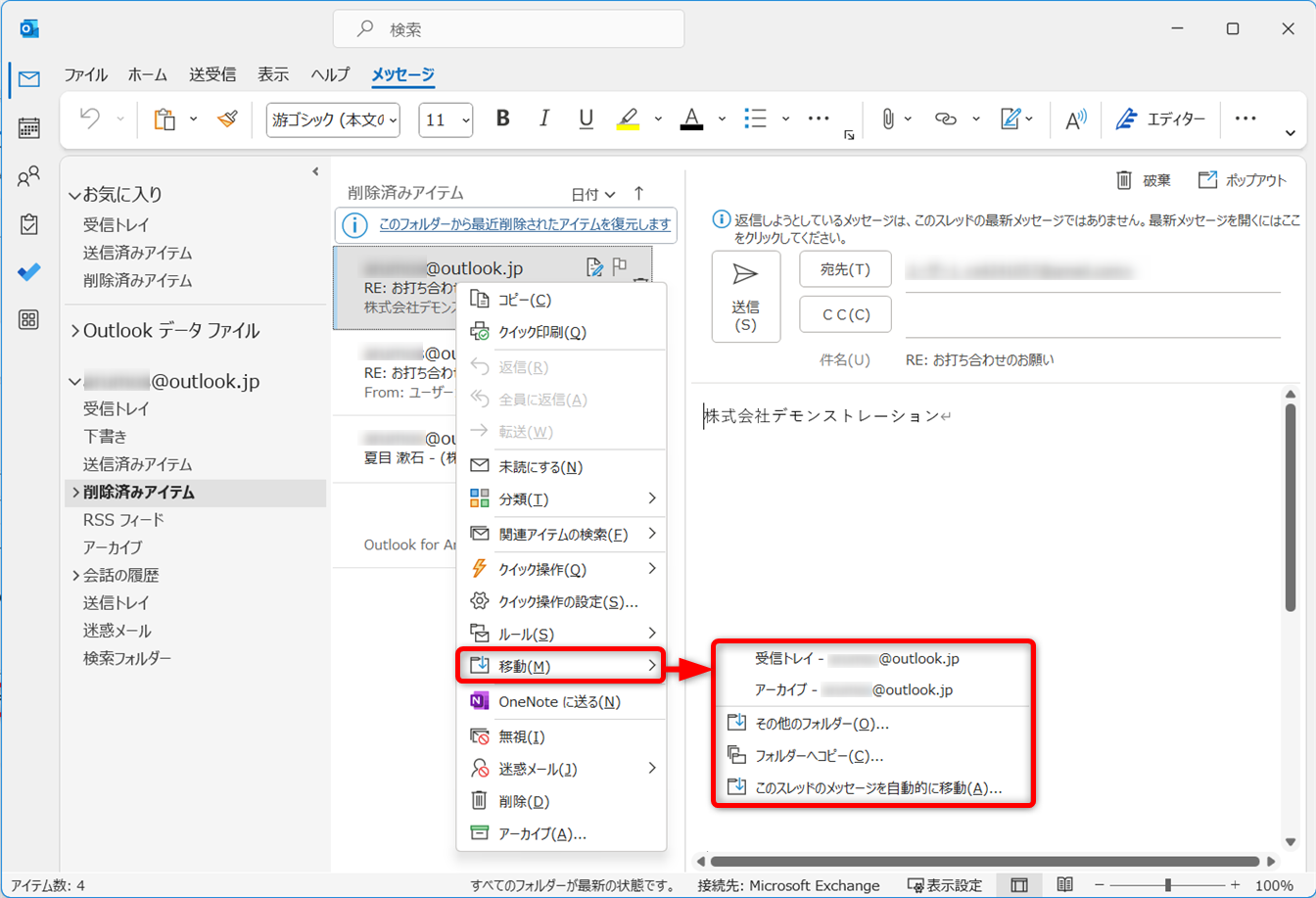 [移動]をクリック、どのフォルダーに戻すか選択します。