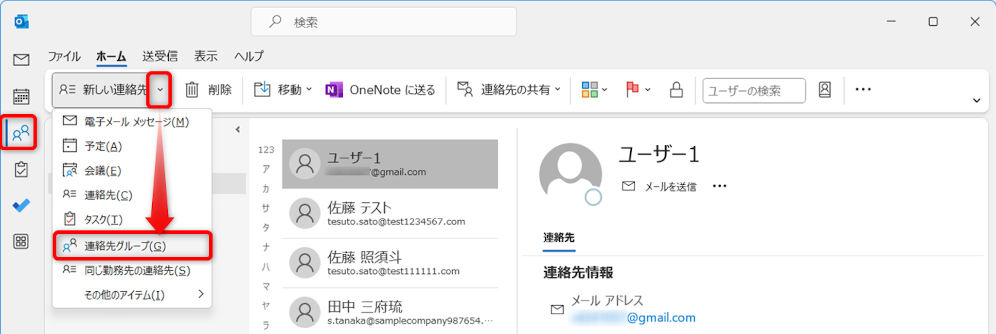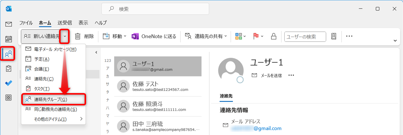 [新しい連絡先]の右側にある下向き矢印をクリックし、次に[連絡先グループ]をクリックします。