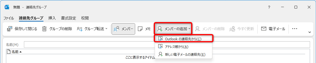 [メンバーの追加]をクリックし、[Outlookの連絡先から]を選択します。