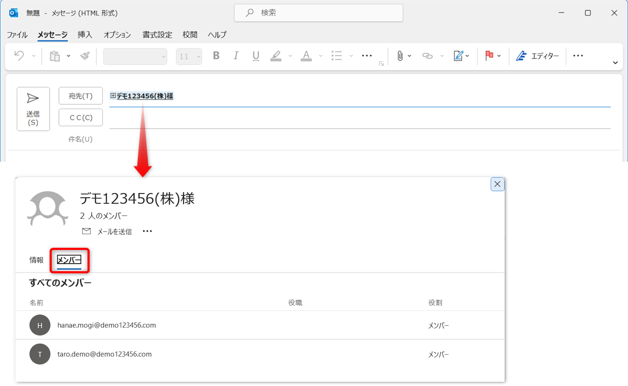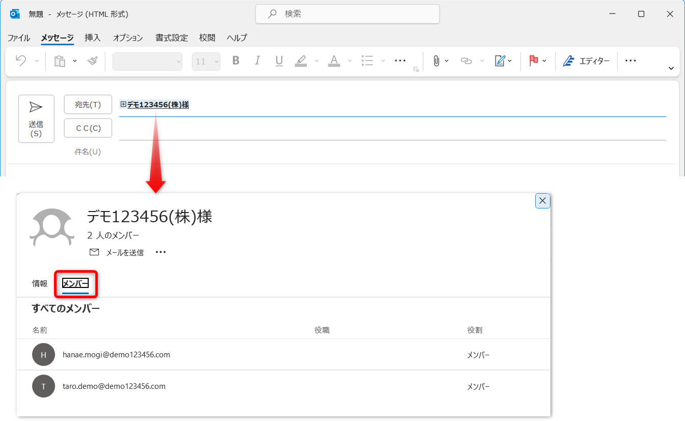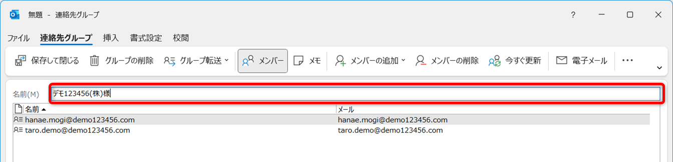 [メンバー]タブをクリックすると、グループに登録されている宛先を確認できます。