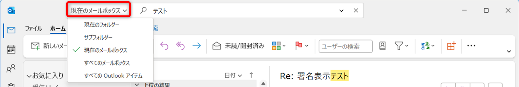 検索対象を変更するには、検索窓の左側にある[現在のメールボックス]をクリックします。