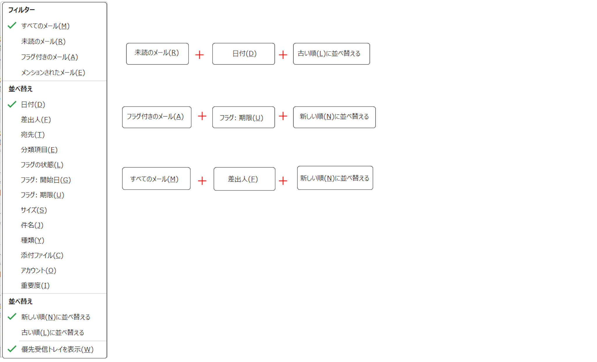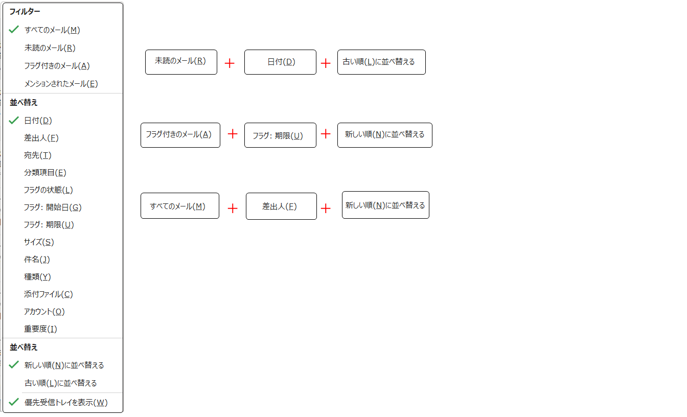 フィルターと並び替えを組み合わせてメールを探しましょう。