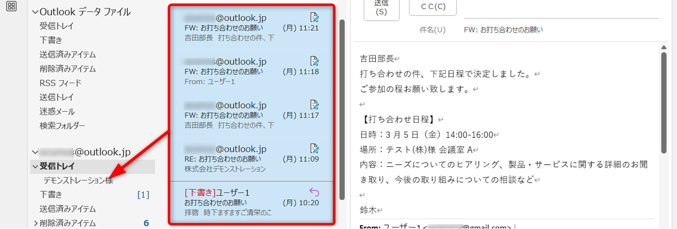 フォルダーに入れたいメールをクリックして選択します。