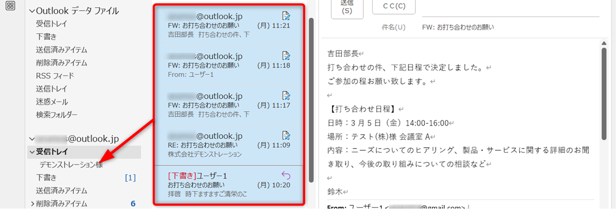 [Ctrlキー]を押しながらクリックすると、クリックしたメールを複数選択します。