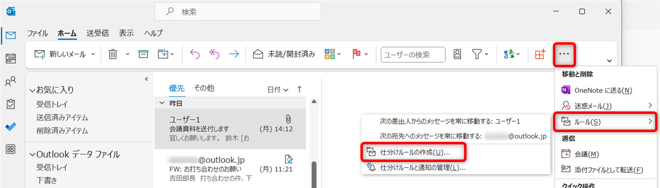 例として、同じ会社から届いたメールを同じフォルダーに仕分けするルールを紹介します。
