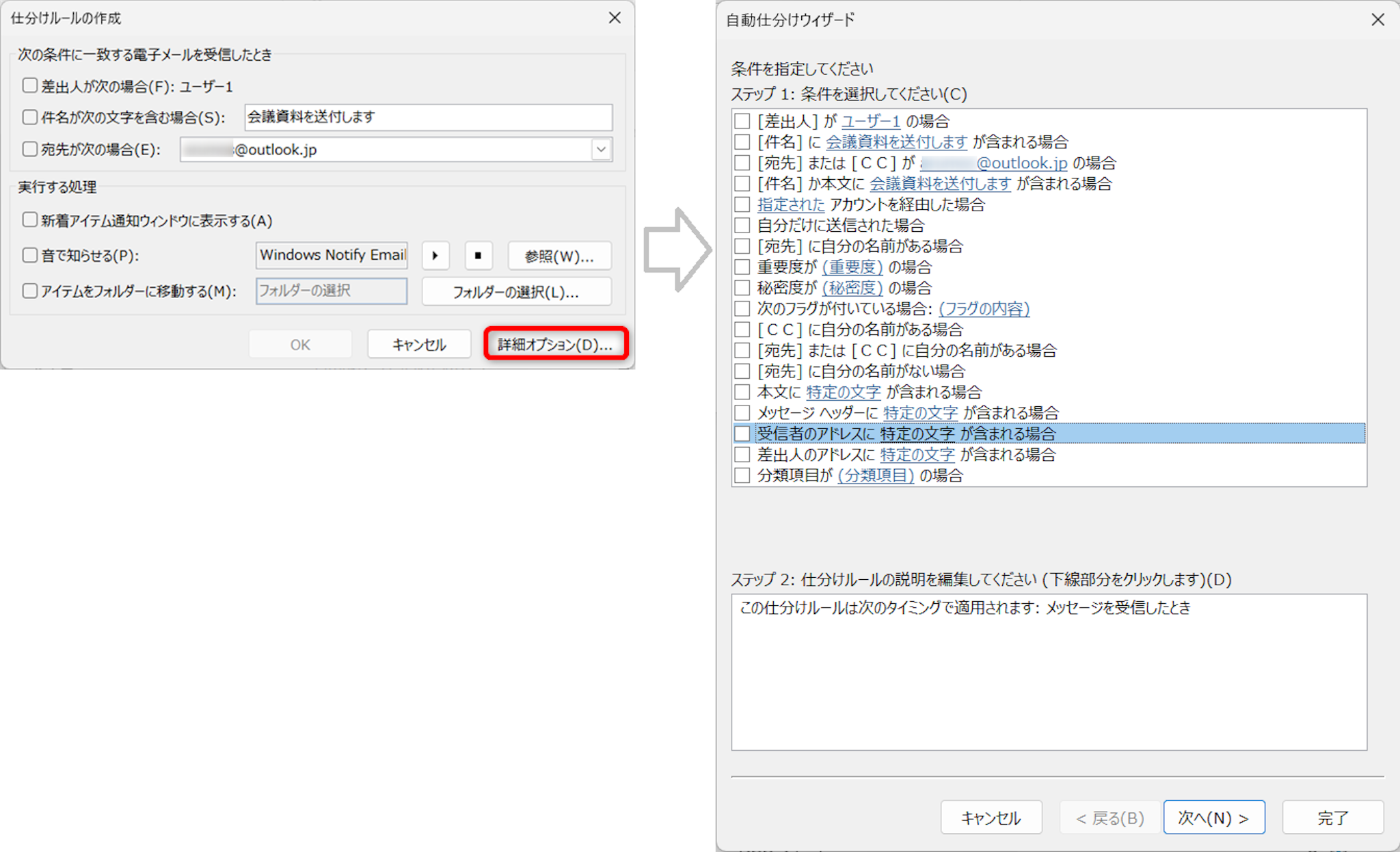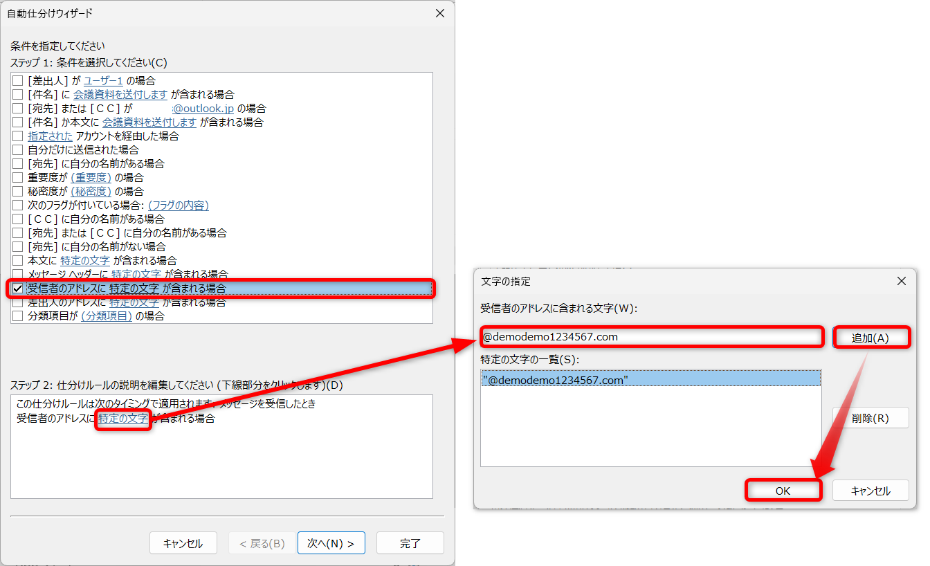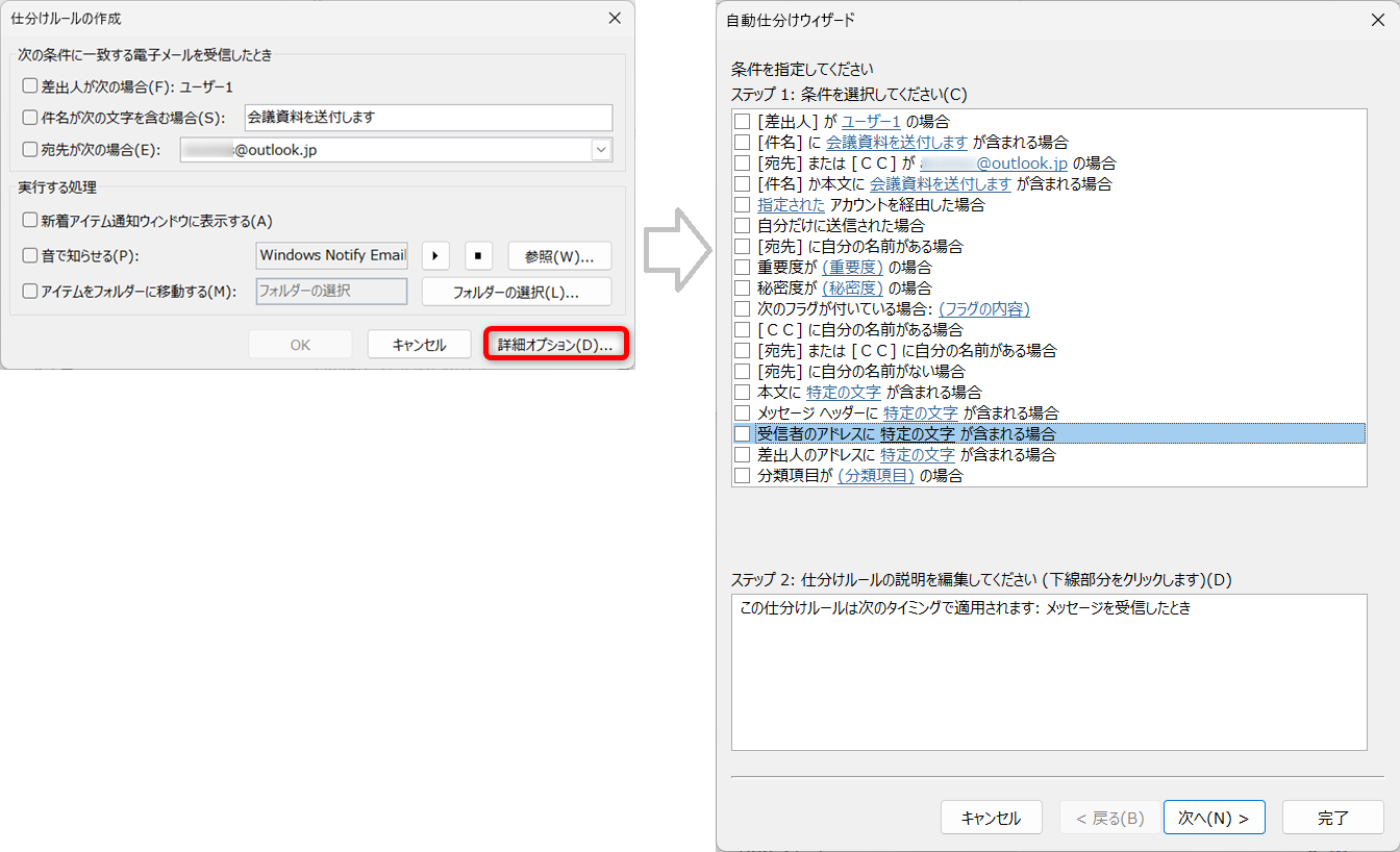 ステップ2に「受信者のアドレスに特定の文字が含まれる場合」が追加されました。