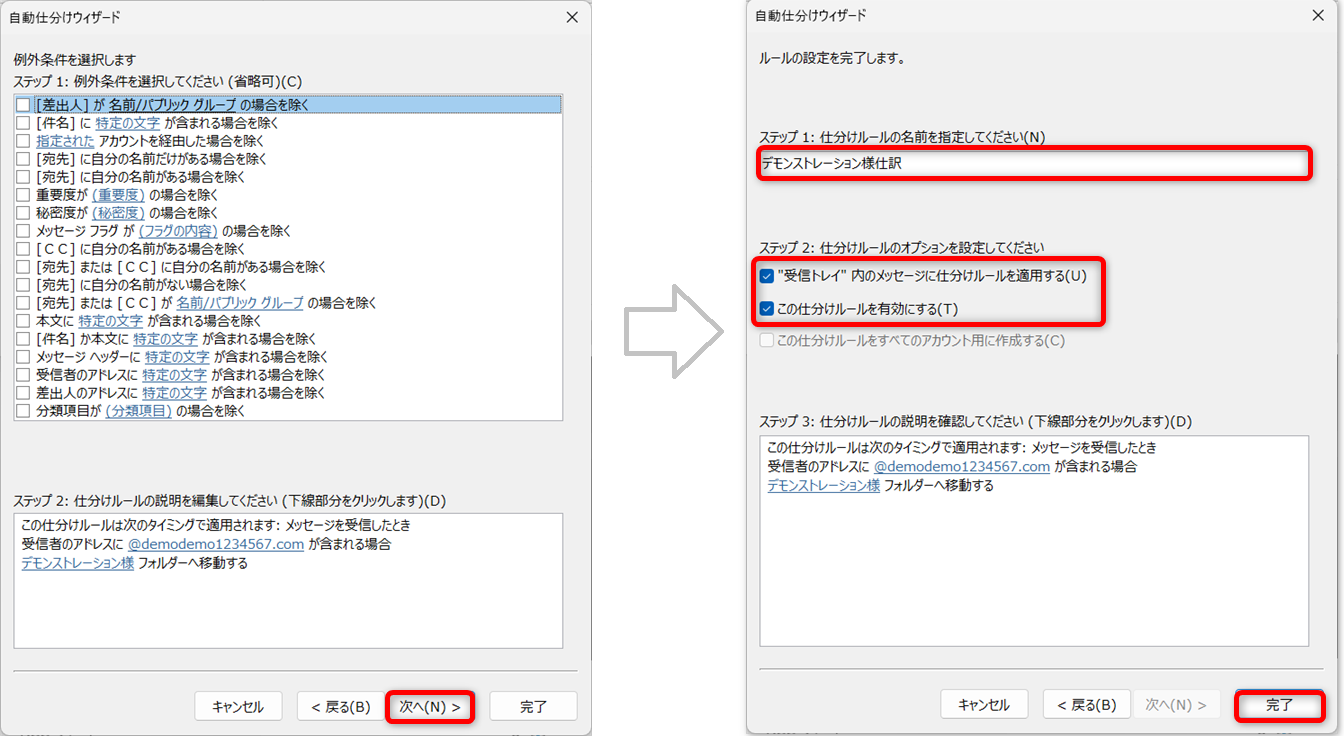受信済みのメールにも仕訳ルールを適用する場合は、「受信トレイ内のメッセージに仕訳ルールを適用する」にチェックを入れてください。