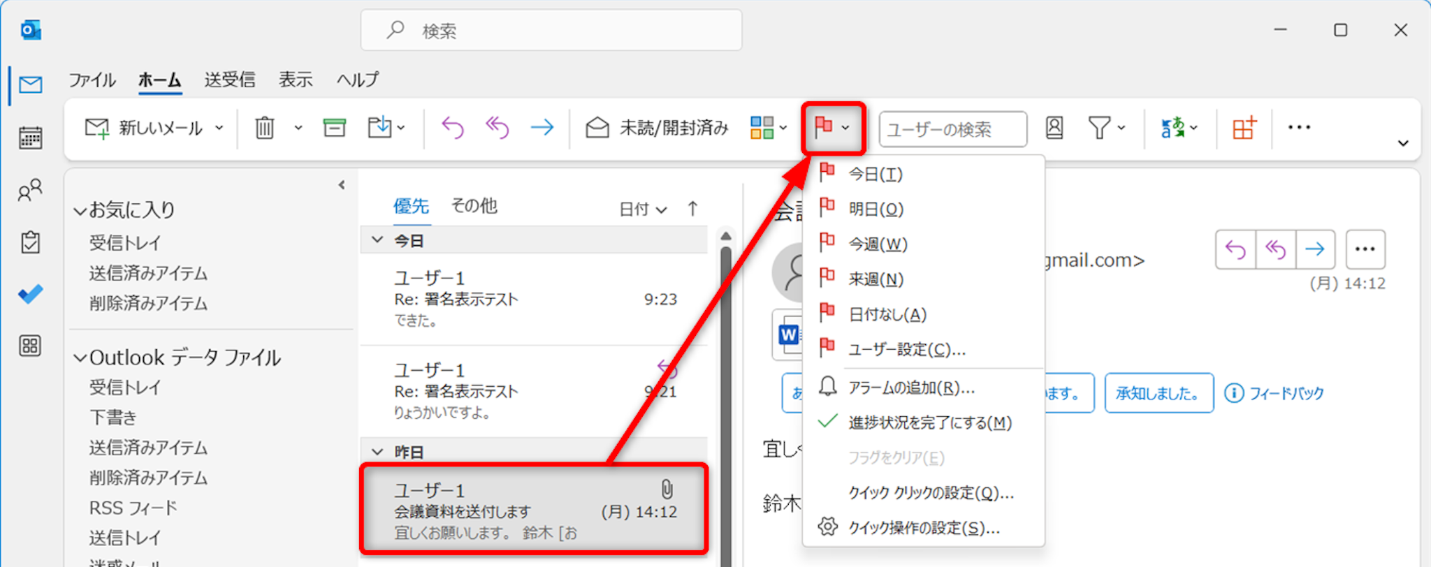 フラグを立てたいメールを選択して、[フラグ]をクリックします。