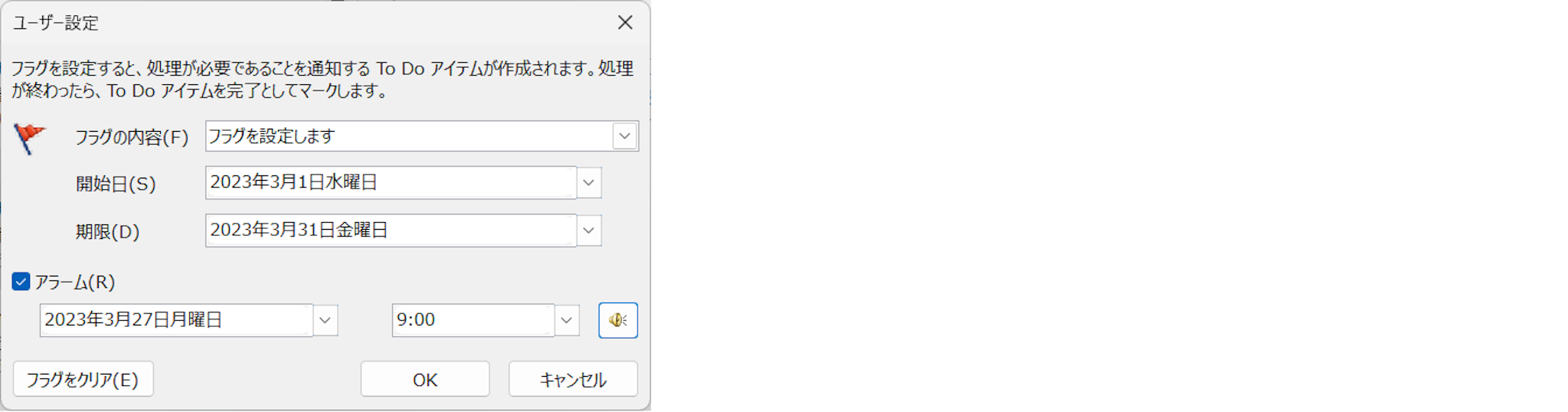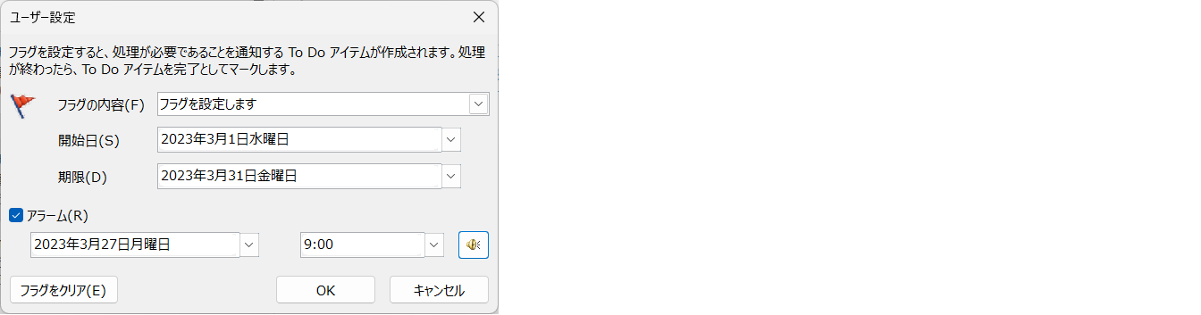 フラグには、処理期限が指定でき、指定したタイミングでアラーム通知をすることができます。