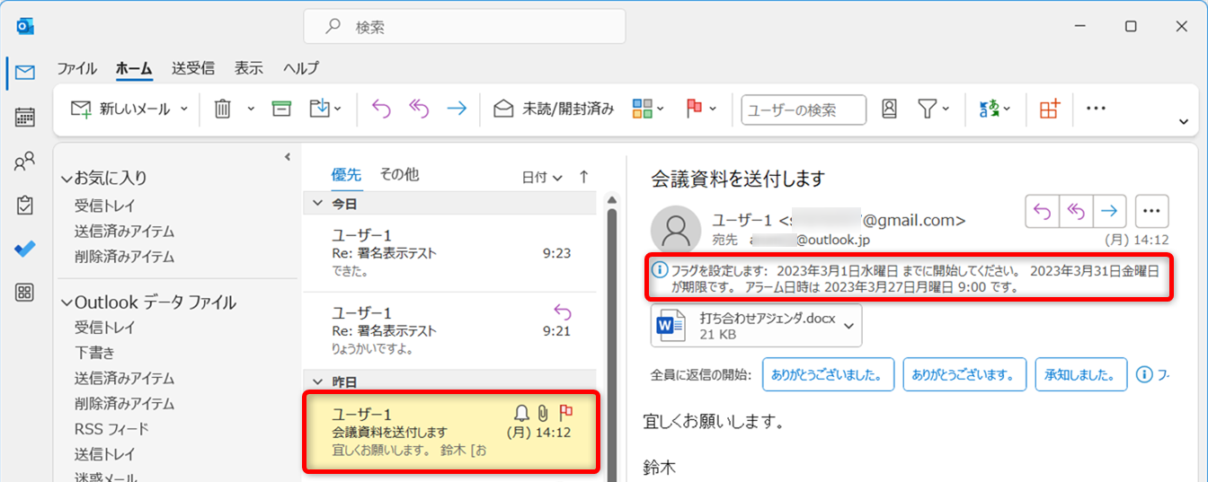 メールに処理期限がある場合、フラグを立てるとタスク管理ができます。