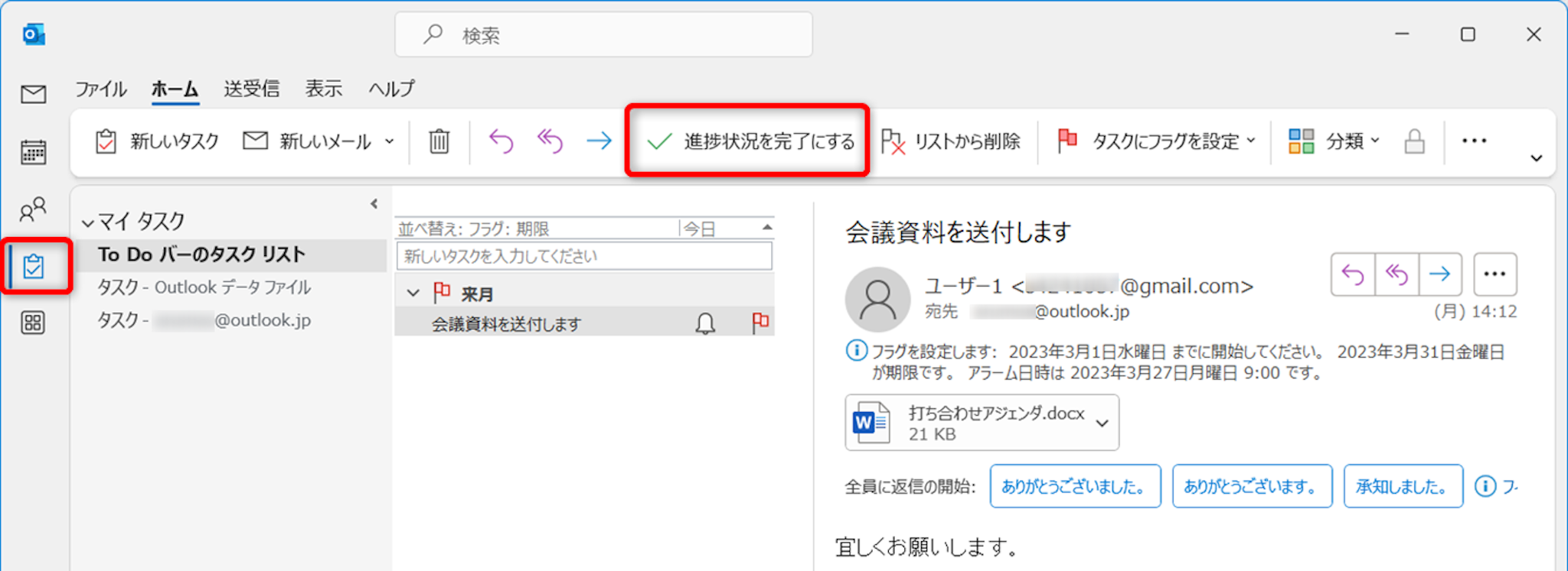 タスクを完了したら、[進捗状況を完了にする]をクリックしてフラグを終了させましょう。