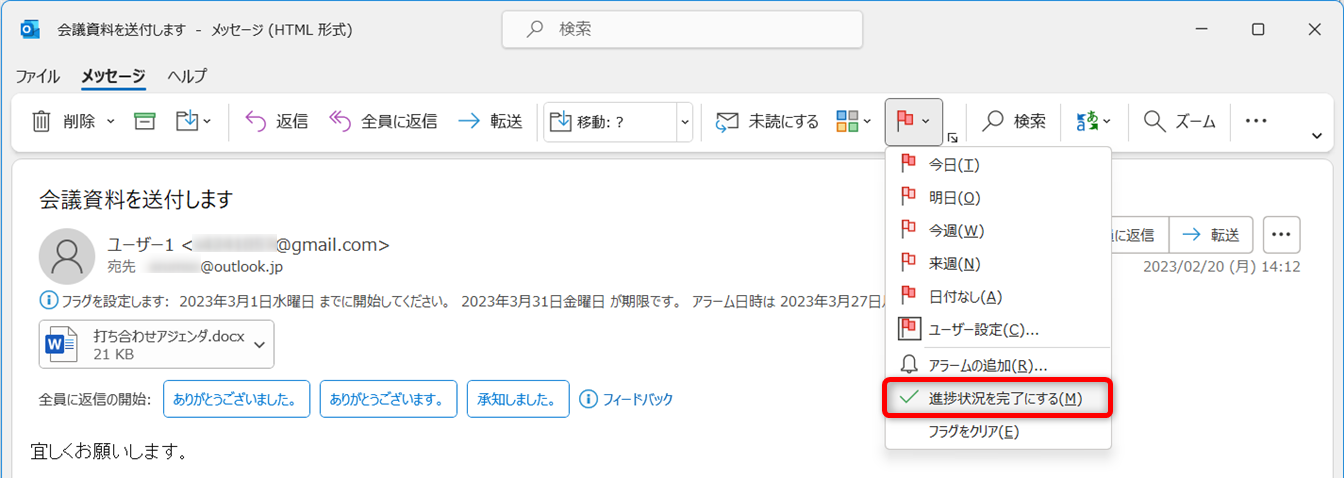 メール画面からもフラグを完了させることができます。