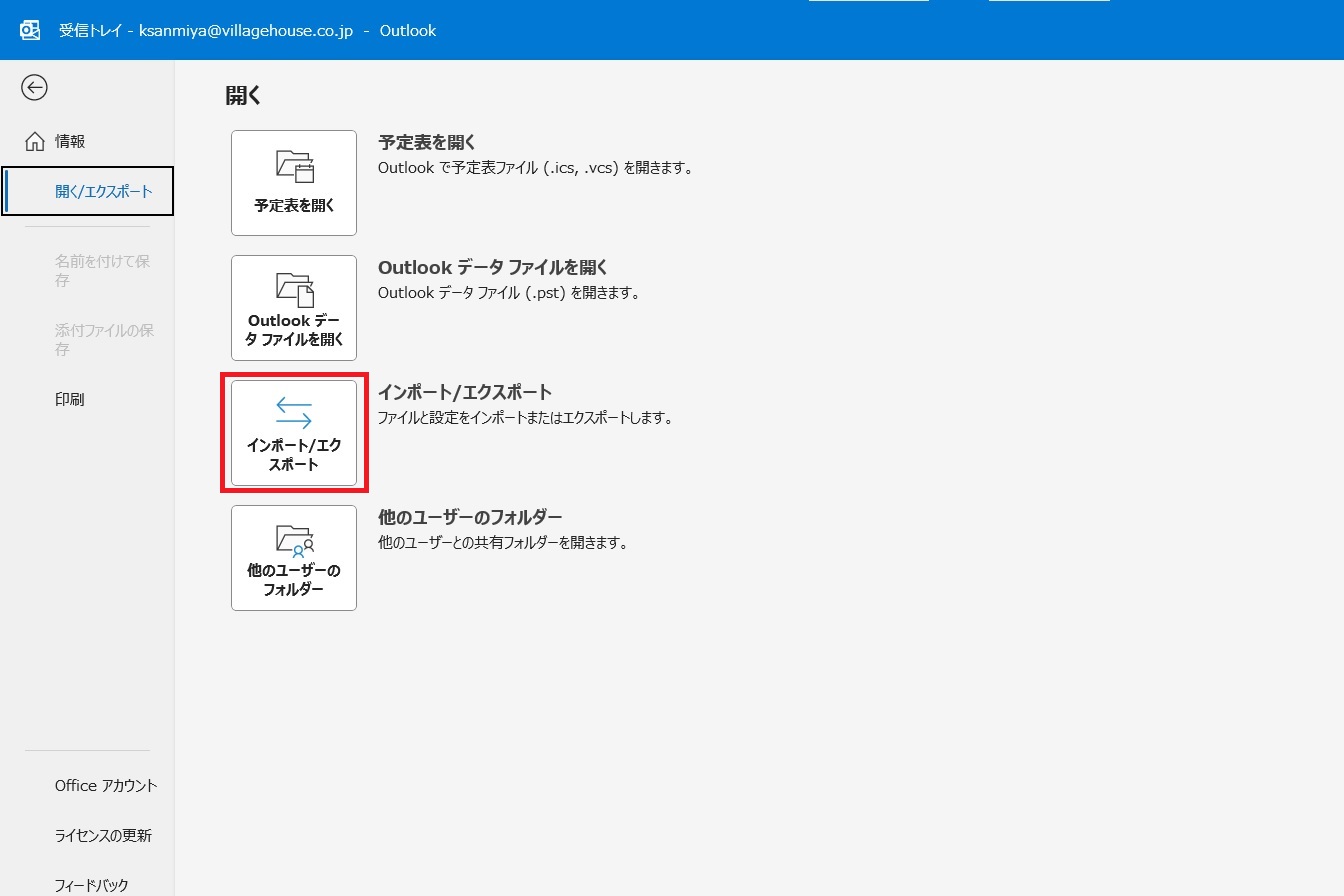 1.「ファイル」タブから「開くとエクスポート」を選択し、「インポート/エクスポート」をクリックします。