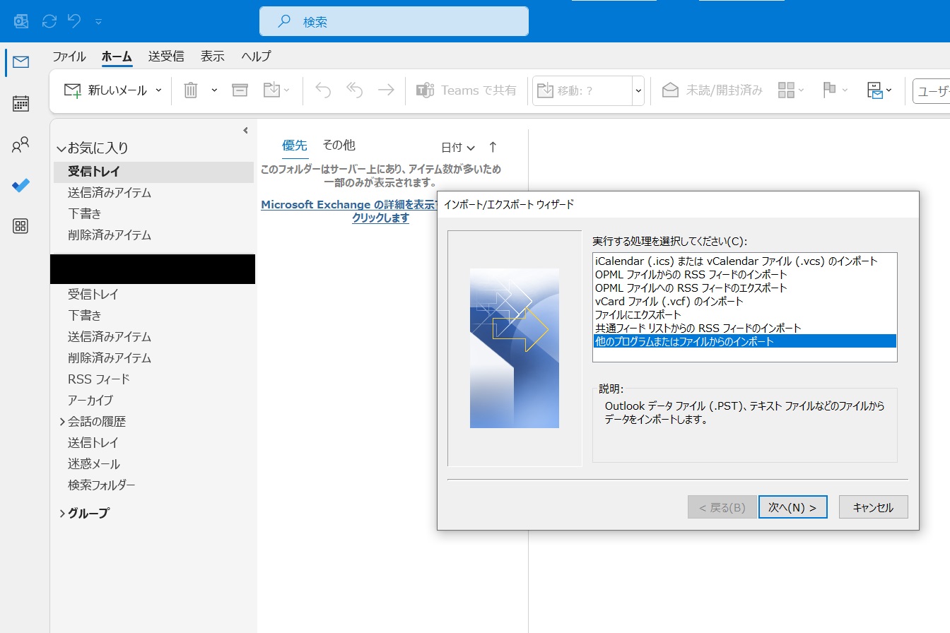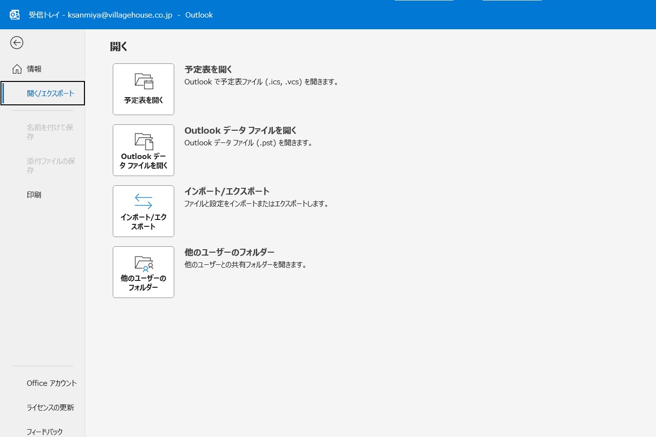 1.出力したいPCでOutlookを開き、「ファイル」タブから「開くとエクスポート」を選択します。