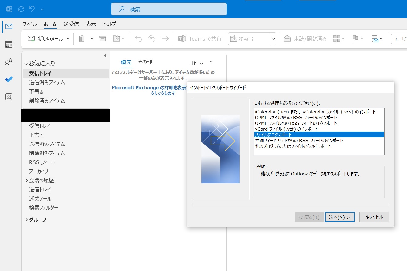 2.「インポート/エクスポート」を選択し、「ファイルにエクスポート」を選んで、「次へ」をクリックします