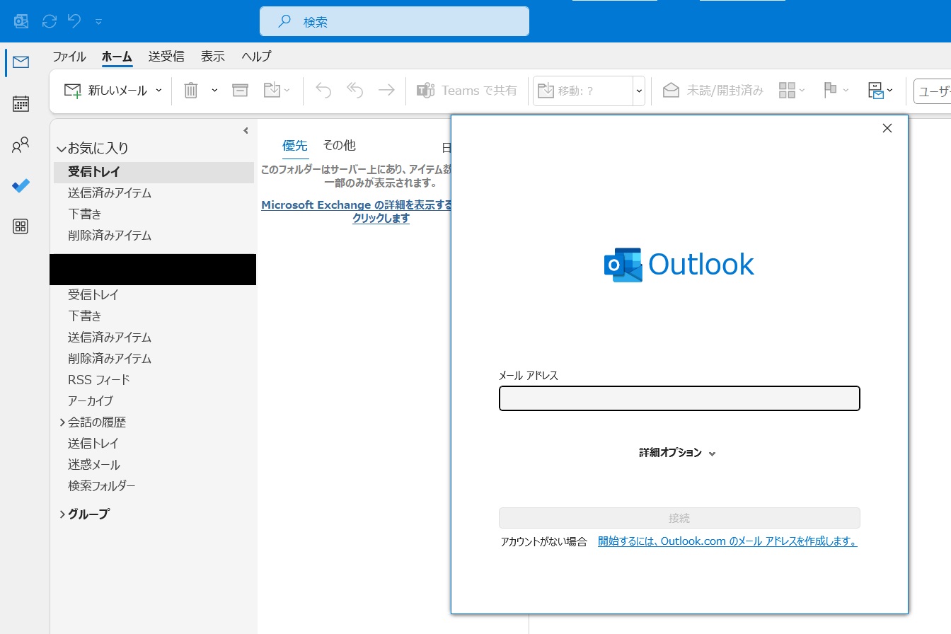 1.新しいアカウントが必要な場合は、PCでOutlookを開きアカウント設定をおこないます。