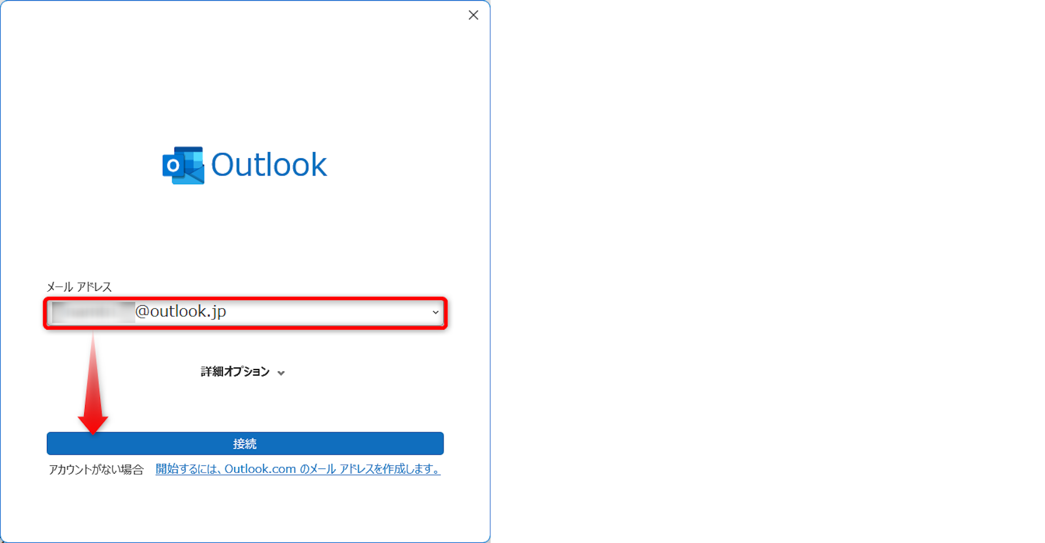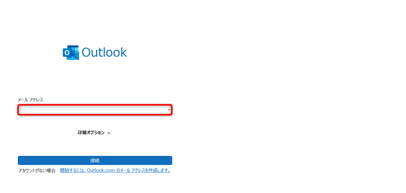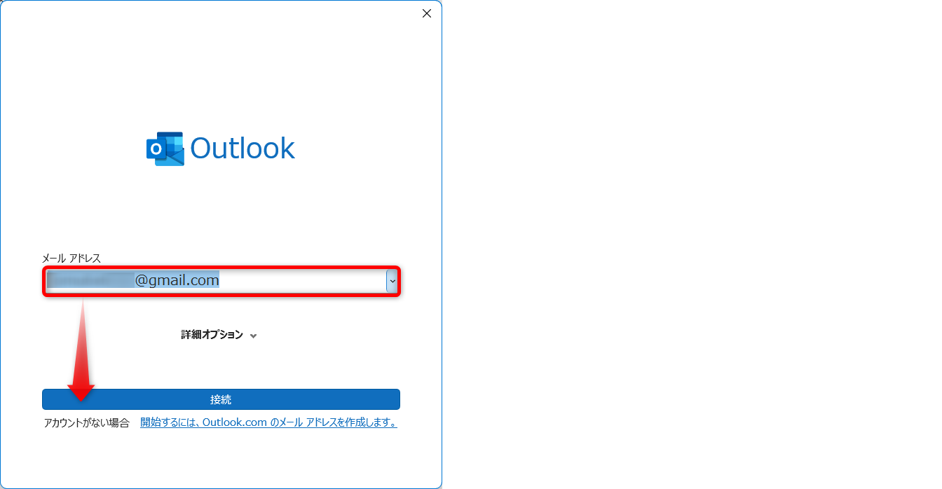 Outlookで管理するメールアドレスを入力します。