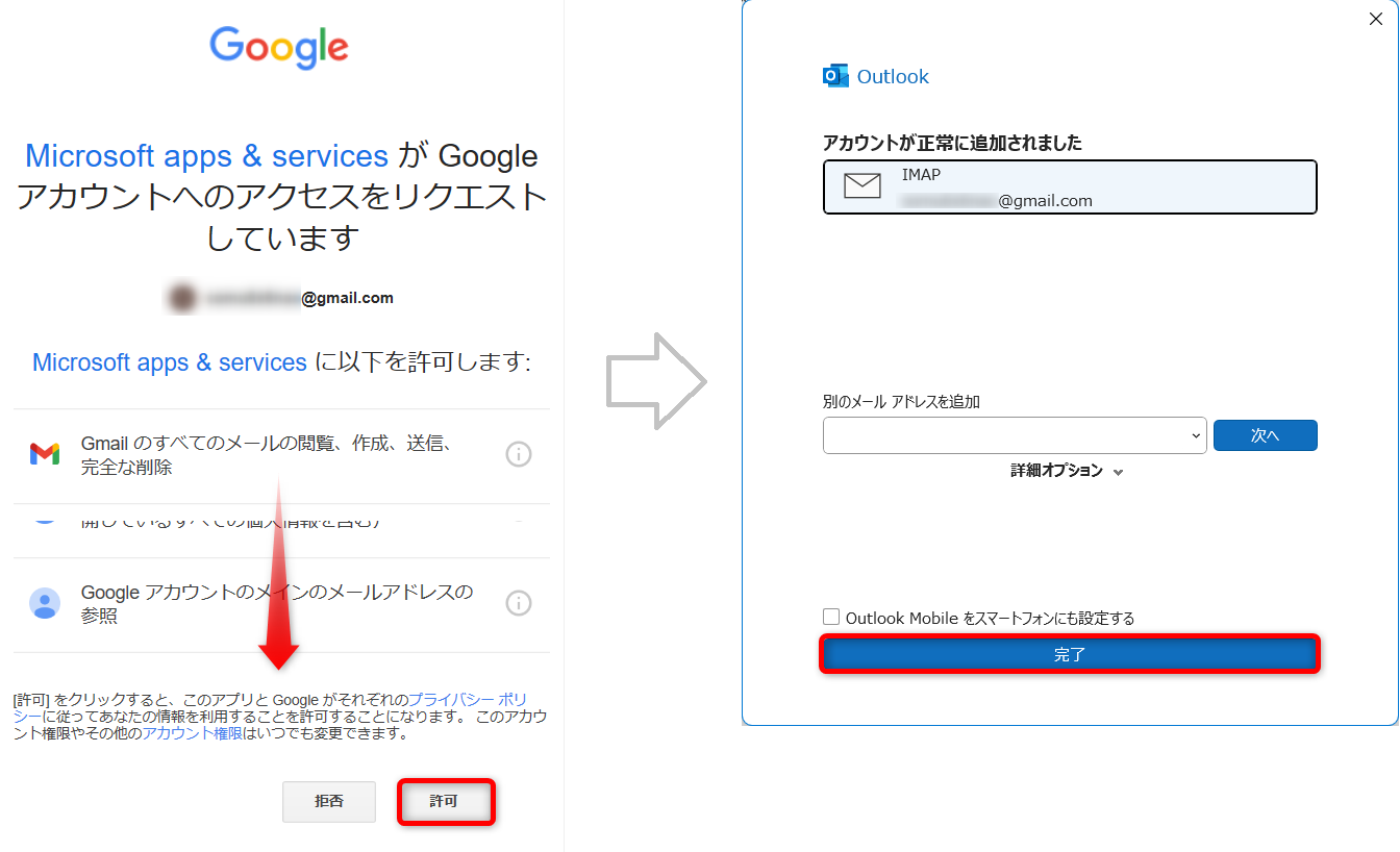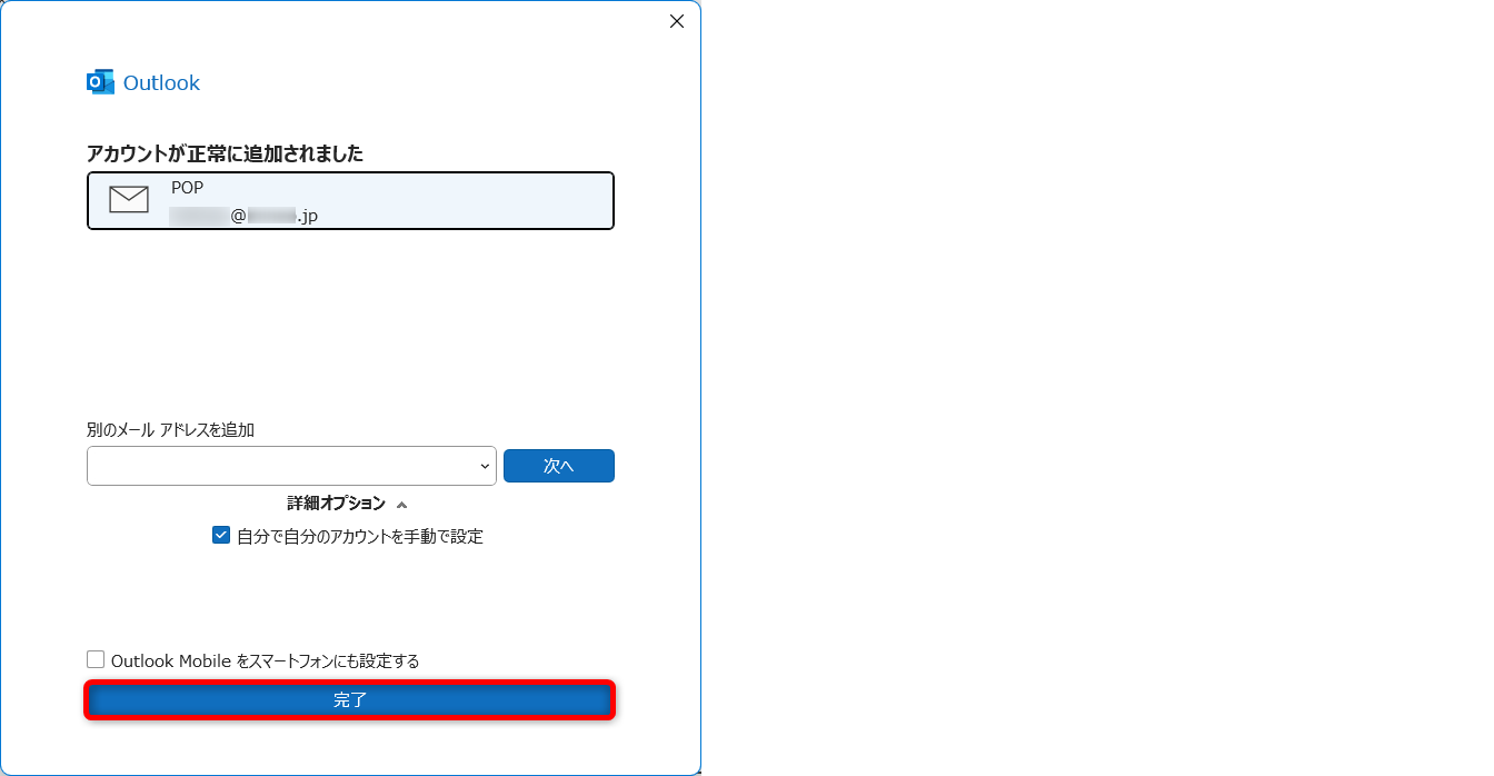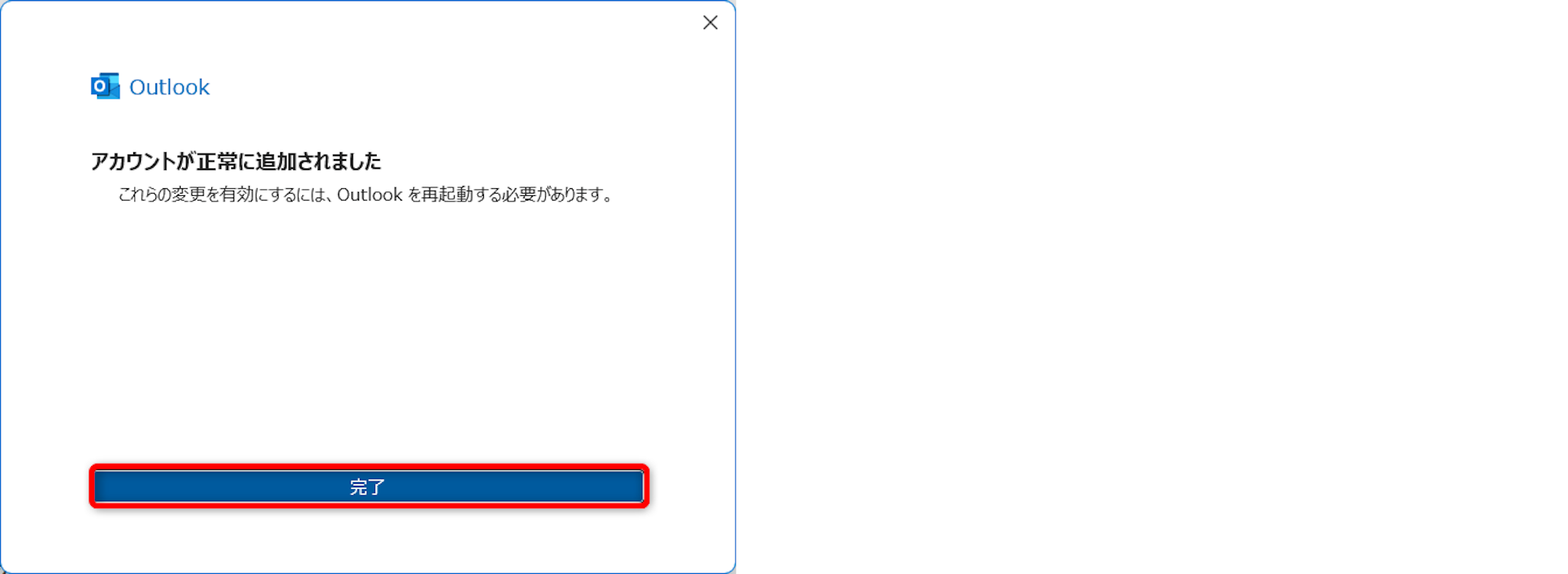 「アカウントが正常に追加されました」と表示されたら、[完了]をクリックします。