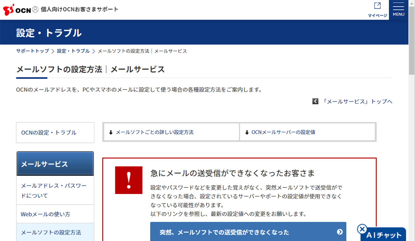 OCNのメール設定、メール設定に関する詳細はこちらで確認できます。