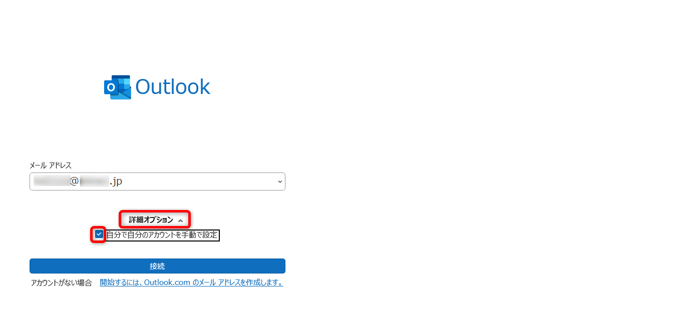 [詳細オプション]をクリック、次に[自分で自分のアカウントを手動で設定]にチェックを入れます。