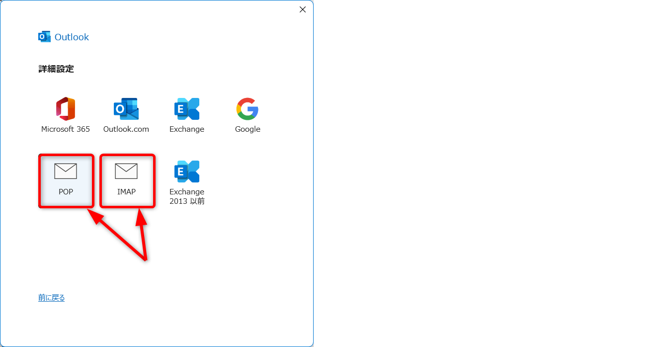 [POP]か[IMAP]をクリックします。