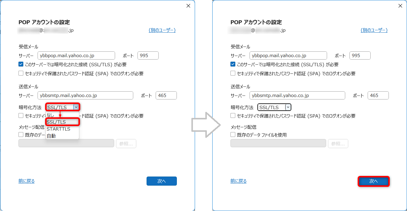 [暗号化方法]をクリックして、[SSL/TLS]を選択します。