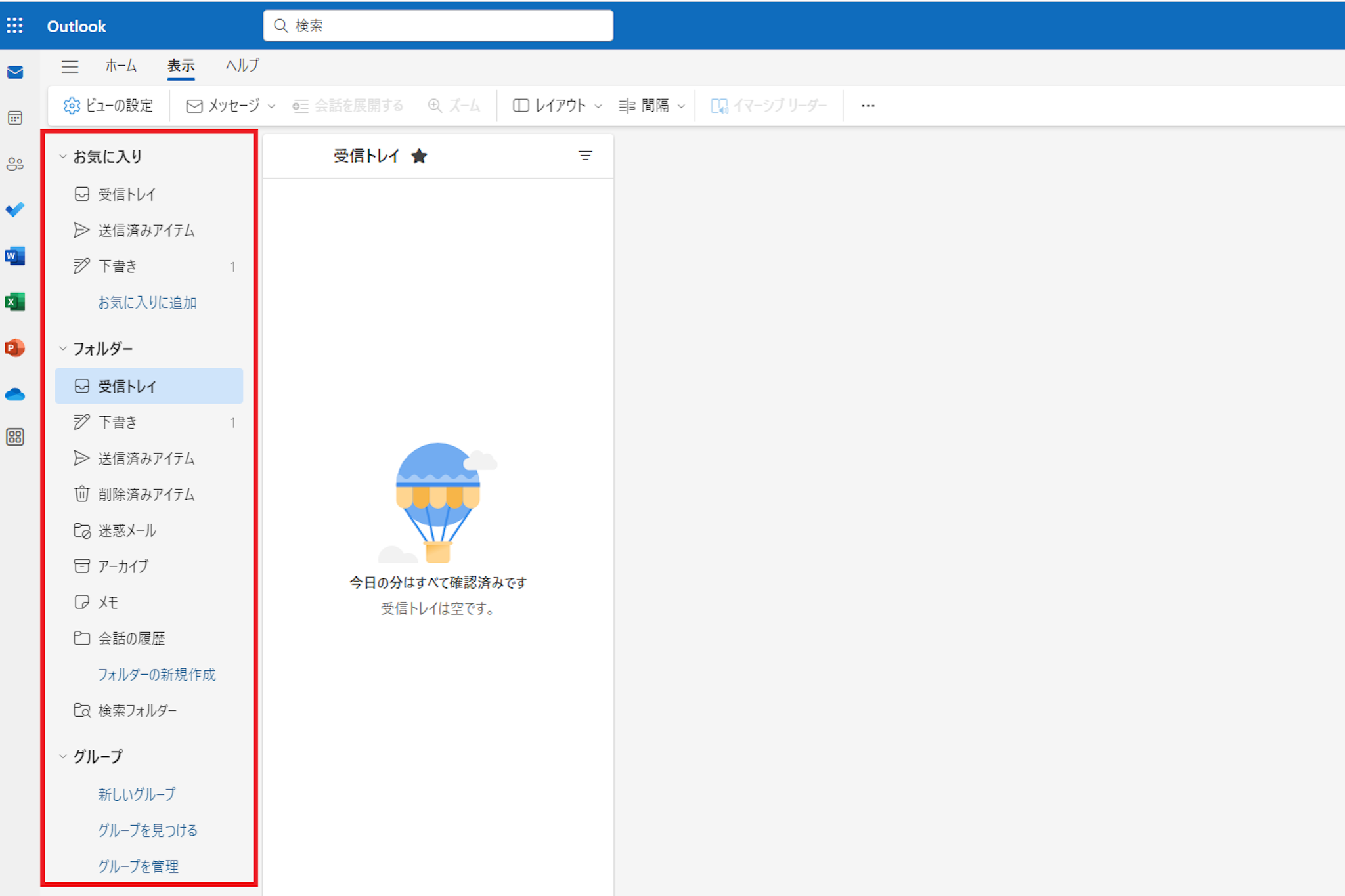 以下の画像の赤枠の箇所をフォルダーウィンドウと呼びます。ここには各アカウントの受信トレイや送信済みアイテムなどのフォルダが一覧表示されます。