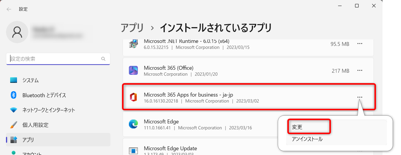 アプリ名の右にある[…]をクリックし、[変更]を選択します。