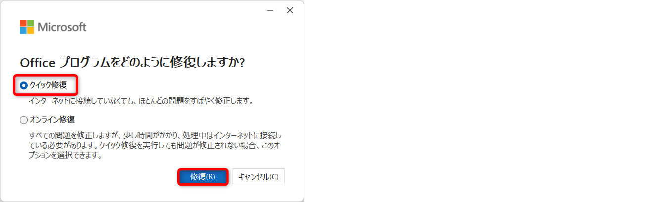 クイック検索にチェックを入れ、[修復]をクリックします。