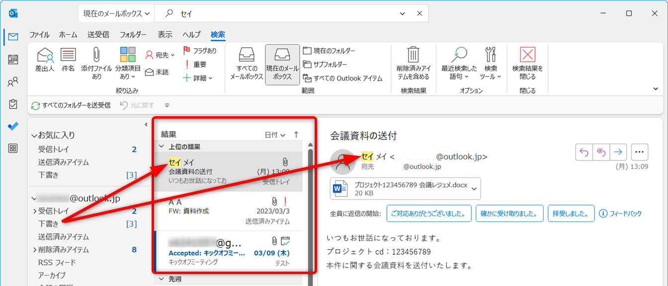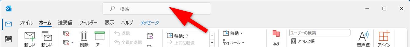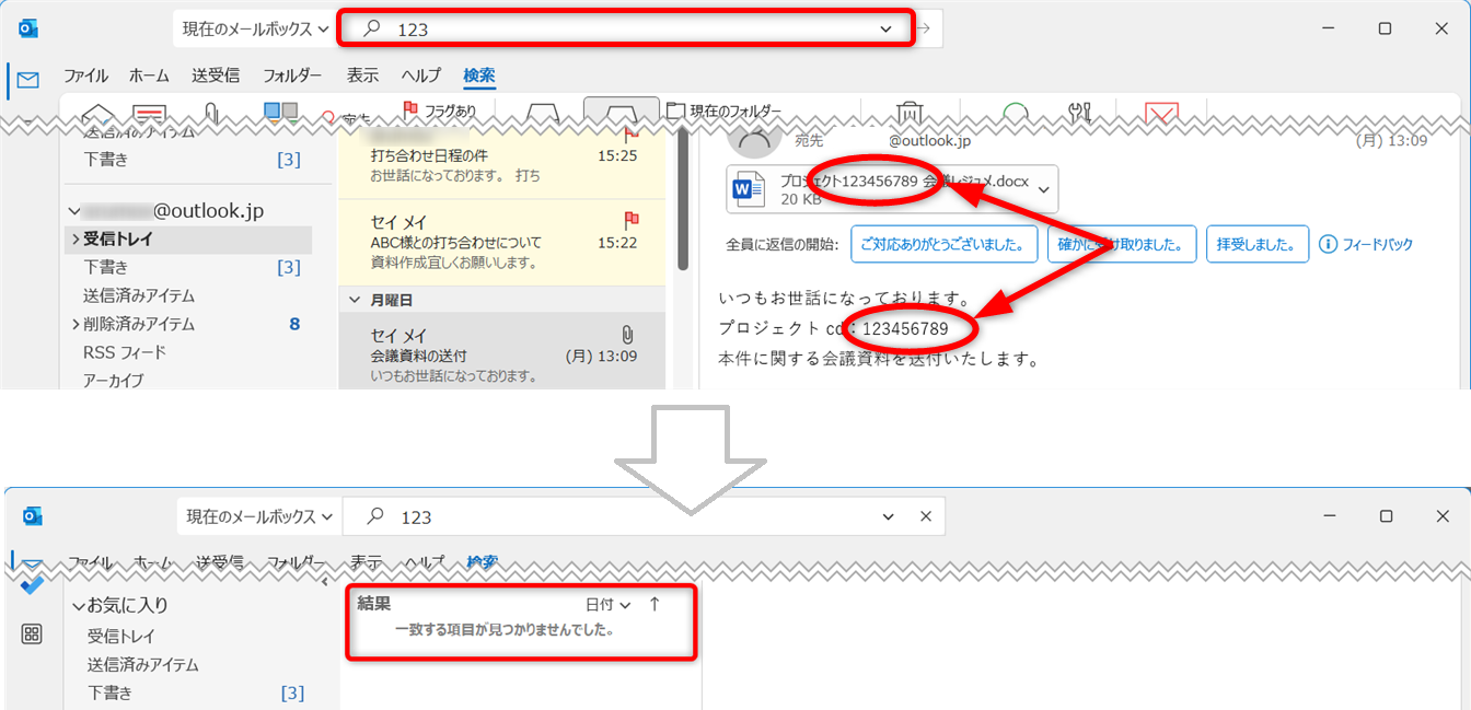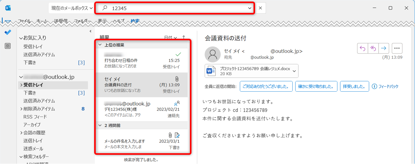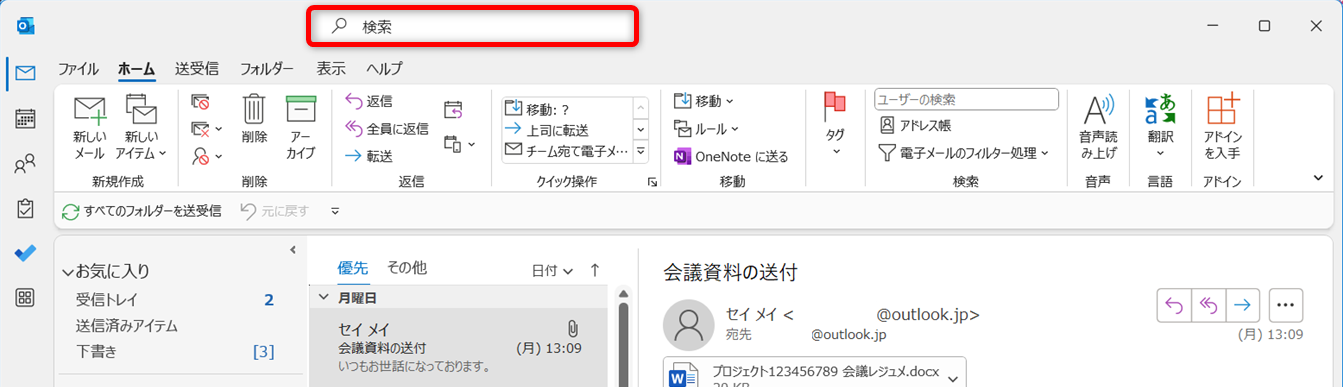 Outlookを開き、検索を試しましょう。