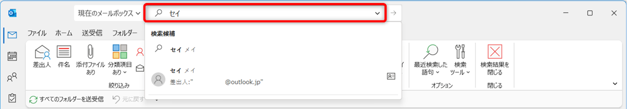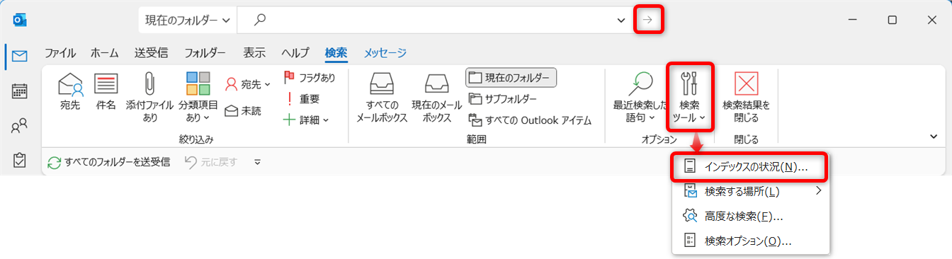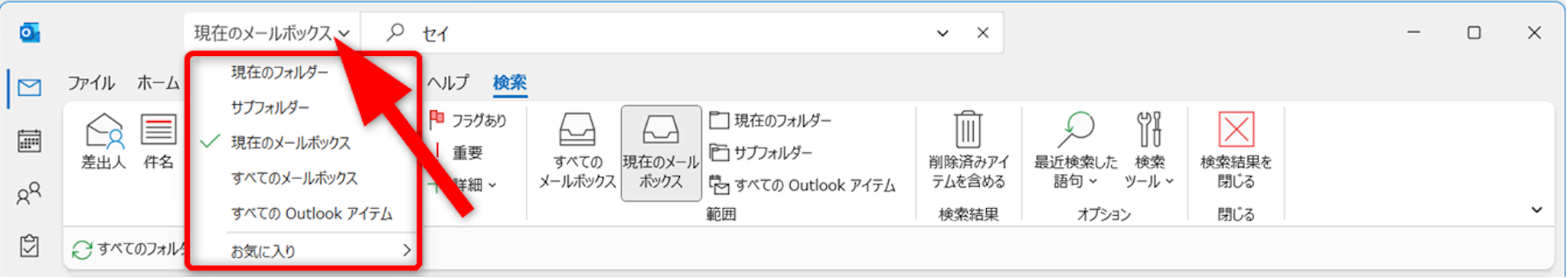[検索]の左横にある[現在のメールボックス]をクリックします。