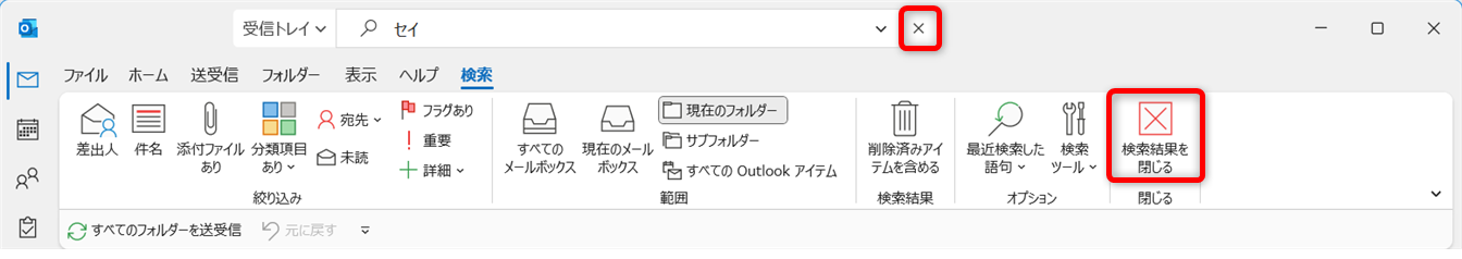 検索していない画面に戻すには、検索の右側にある[×]をクリックするか、[検索結果を閉じる]ボタンをクリックしてください。