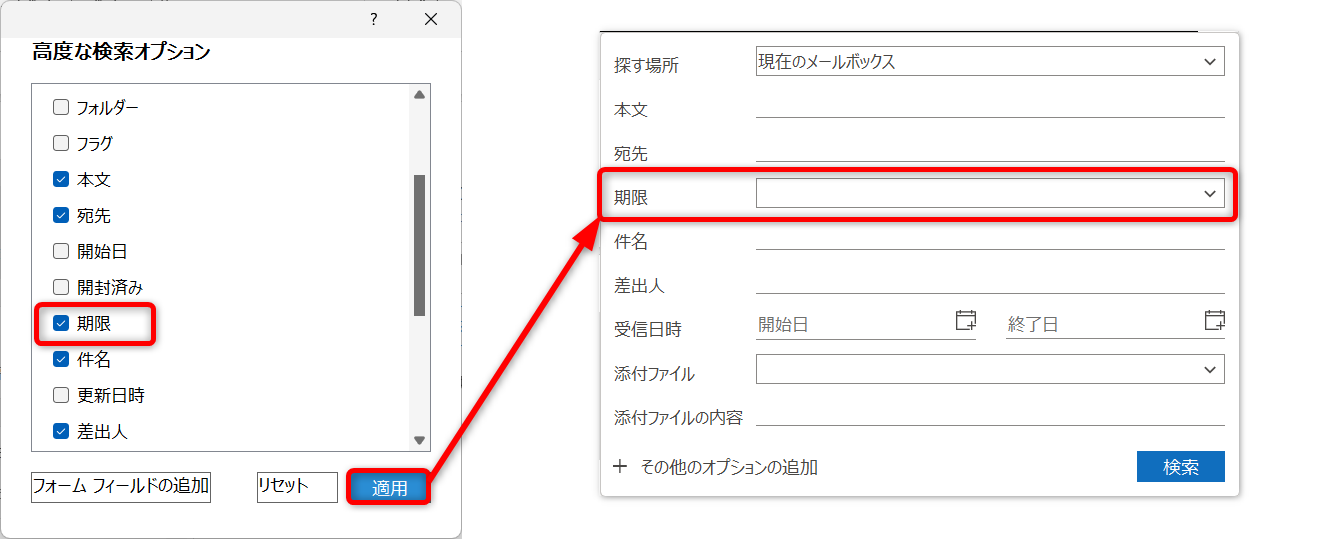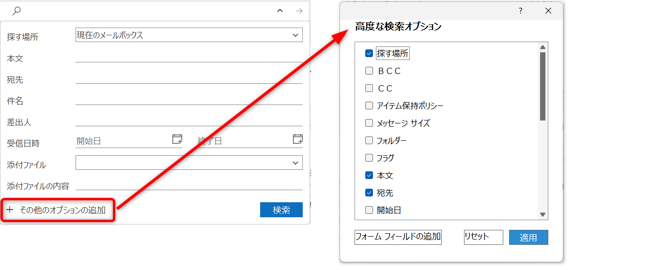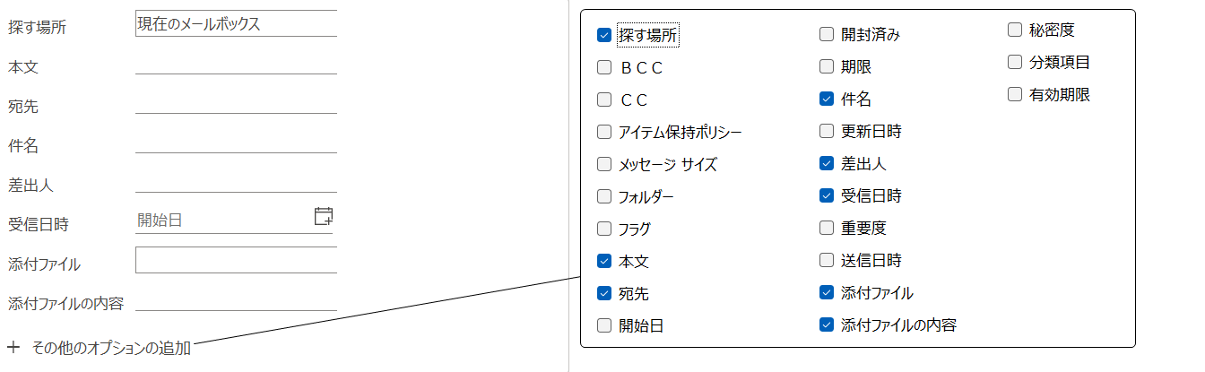 フラグや分類項目が付いているメールを検索するには、[その他のオプションの追加]をクリックします。