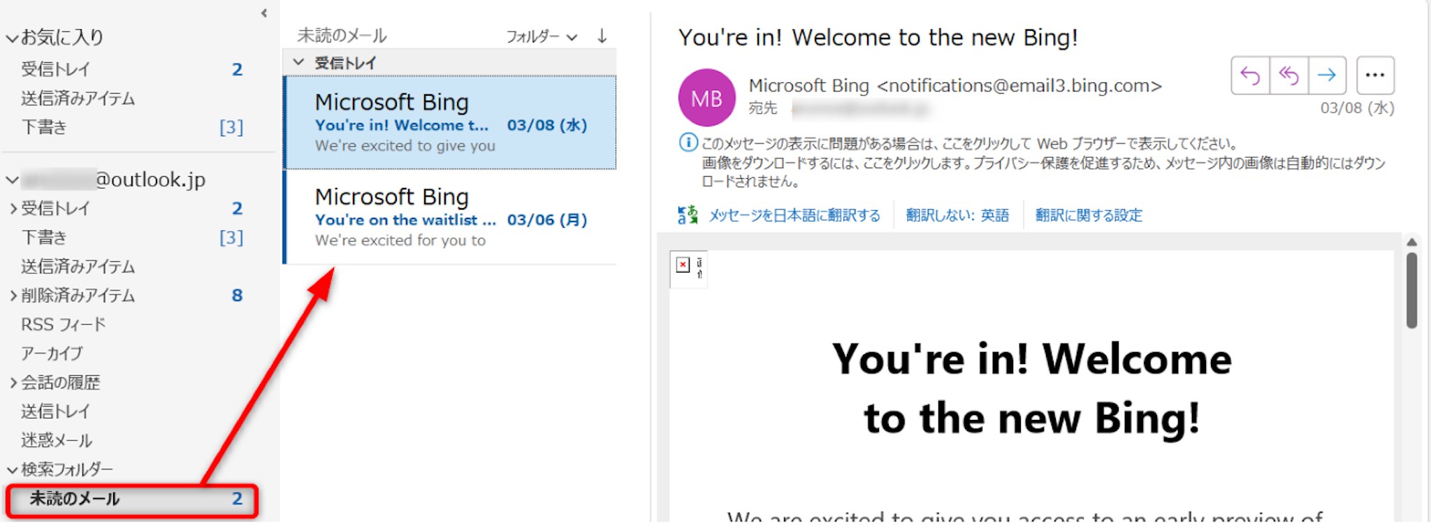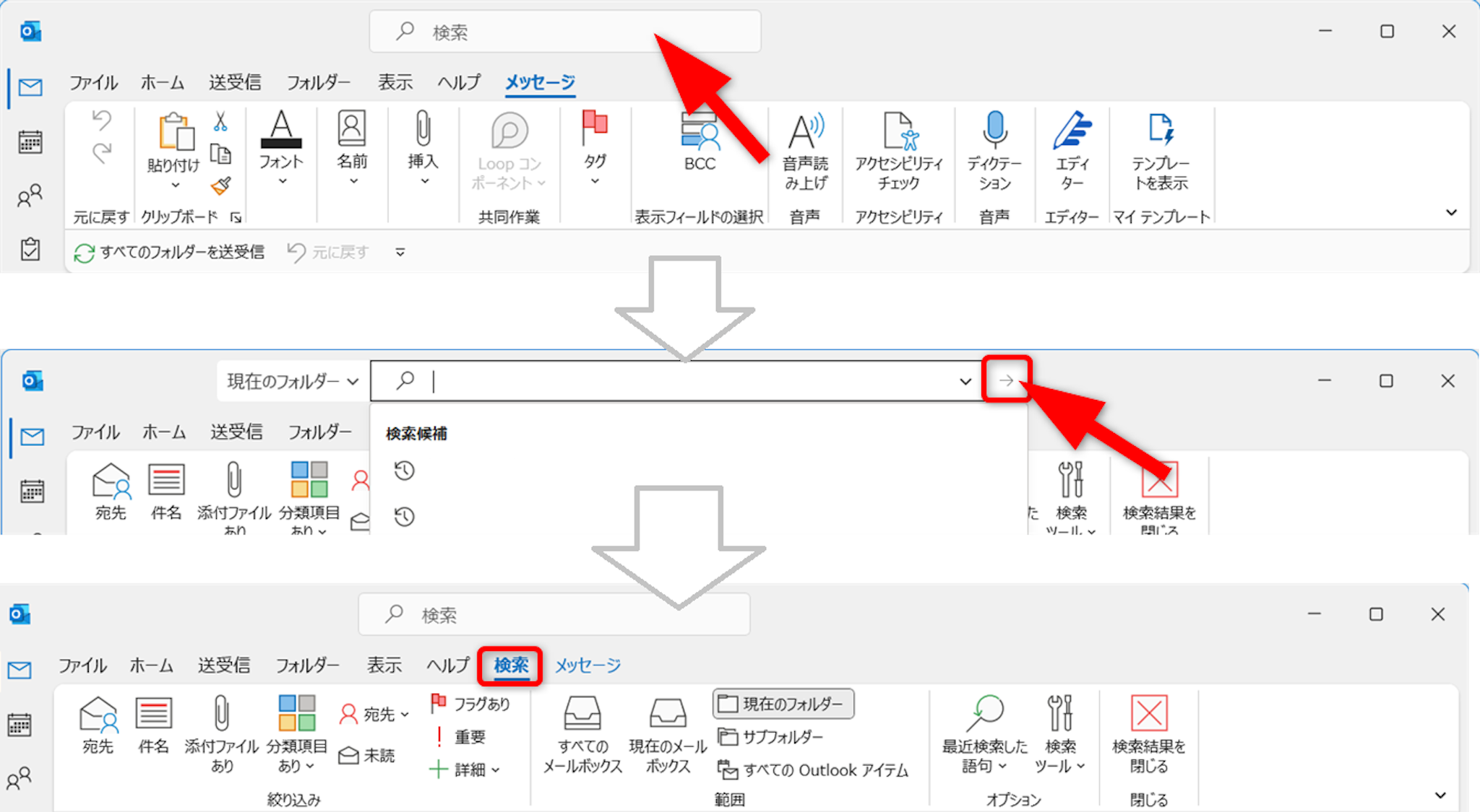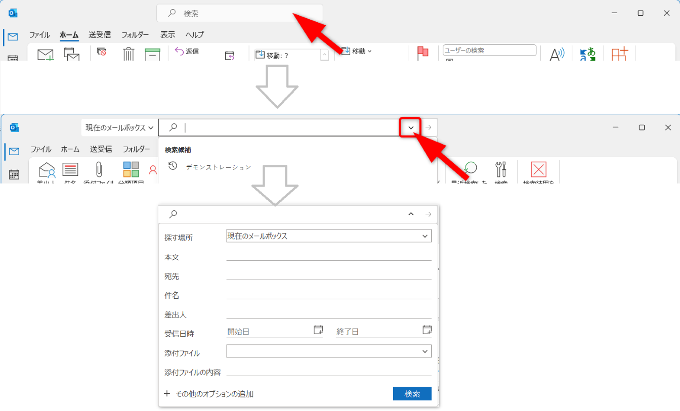 Outlookの[検索ボックス]をクリック、次に[→]をクリックします。