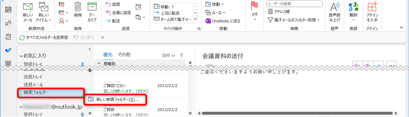 [検索フォルダー]を右クリックして、[新しい検索フォルダー]を選択します。