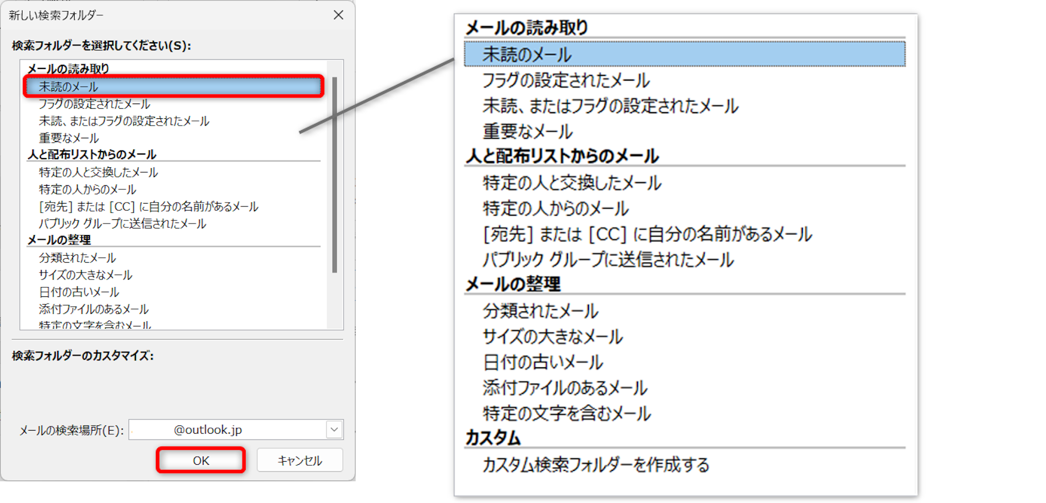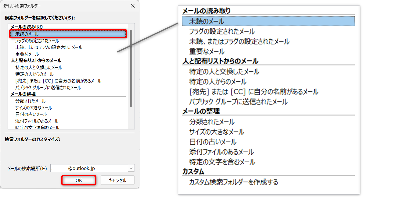 [未読のメール]をクリックして[OK]します。