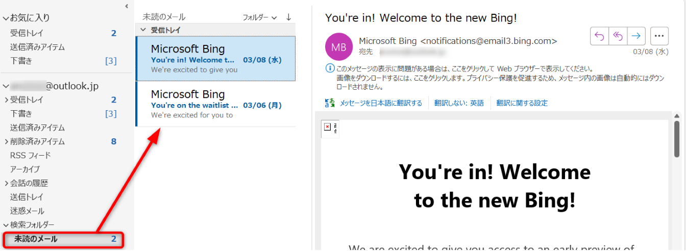 検索フォルダーに[未読のメール]フォルダーが作成され、未読メールだけが抽出されました。