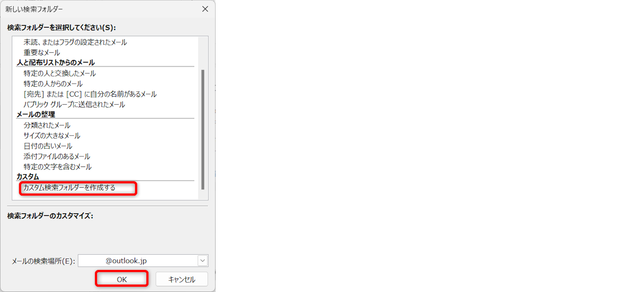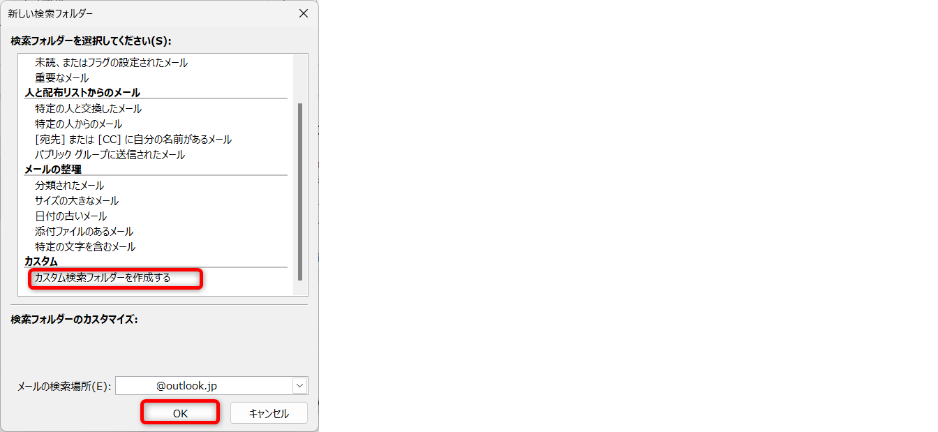 「カスタム検索フォルダーを作成する」を選択して[OK]をクリックします。