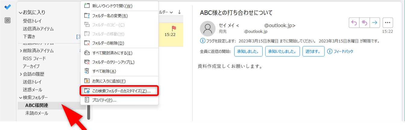 条件を変更するときは、変更する検索フォルダーを右クリックします。