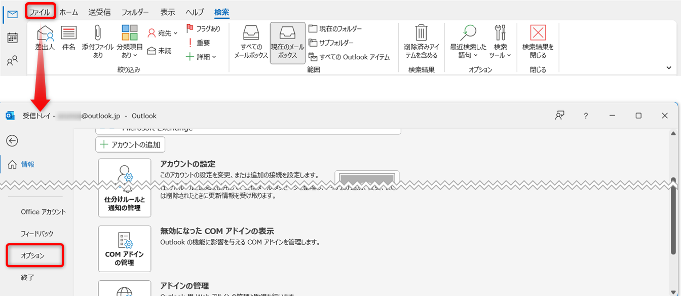 ※メールアカウントの種類(POP/IMAP/Exchange)やOutlookのインストール形態(Microsoft Store版か通常版か)によって、インデックスの処理が異なる場合があります。複数のアカウントがある場合は、どのアカウントで検索ができないか切り分けて確認することも解決の糸口になります。