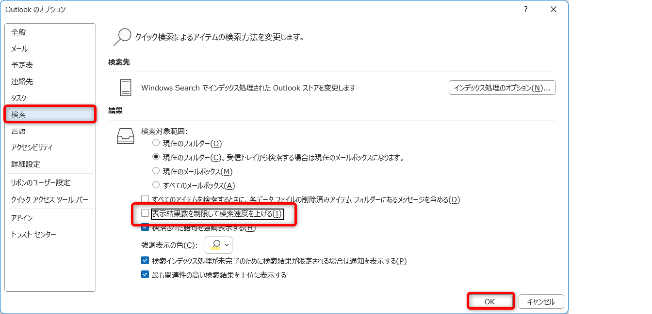Outlookの検索はWindows Searchを使っているので、検索がうまくいかないときはWindows Searchの状態を確認してみましょう。