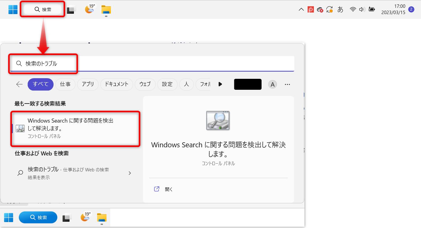 Windowsの検索をクリックして「検索のトラブル」と入力します。