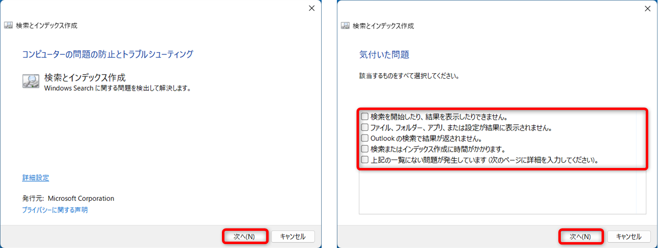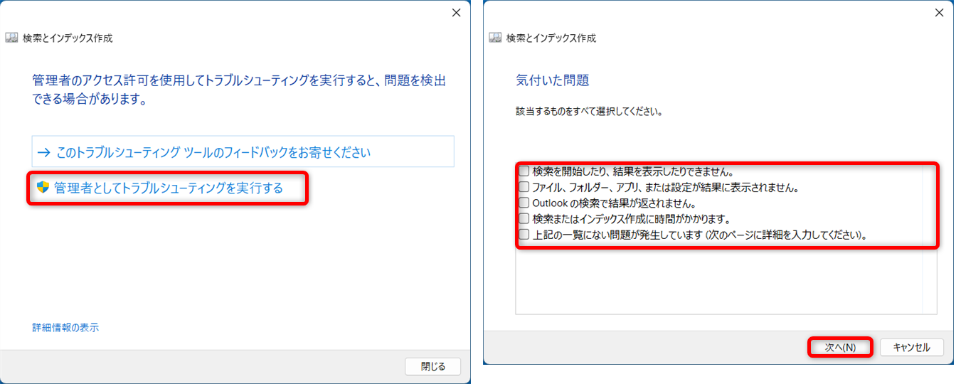「Windows Searchに関する問題を検出して解決します」をクリックしてください。