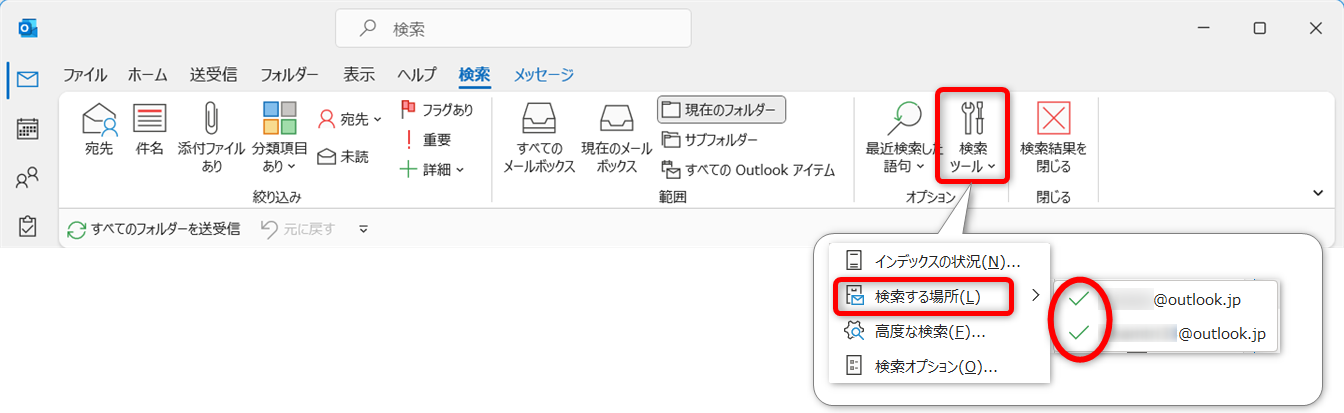 他のメールボックスや、予定、タスクなどからも検索したい場合は、検索範囲を変更しましょう。