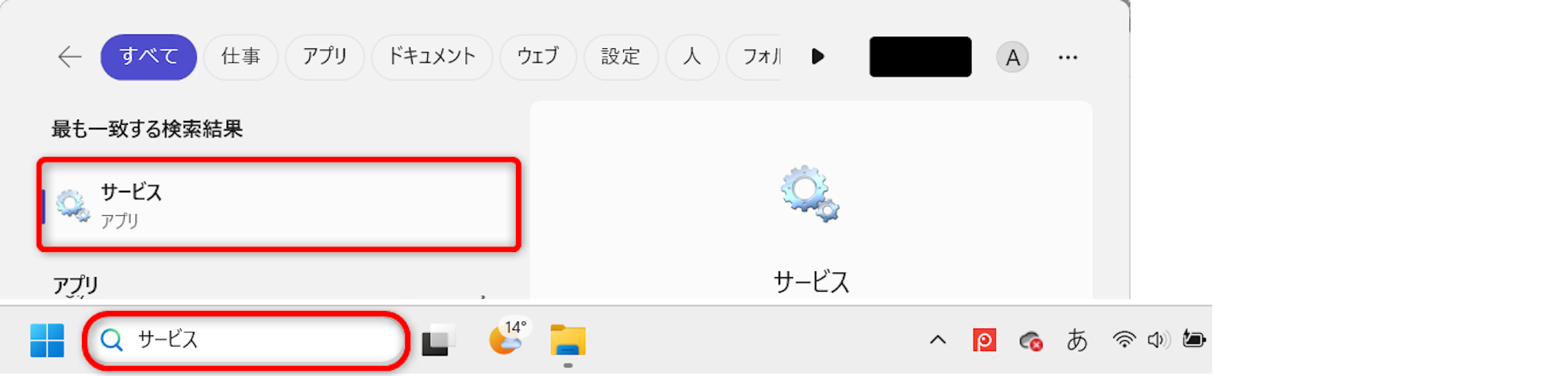Windowsの検索に「サービス」と入力します。