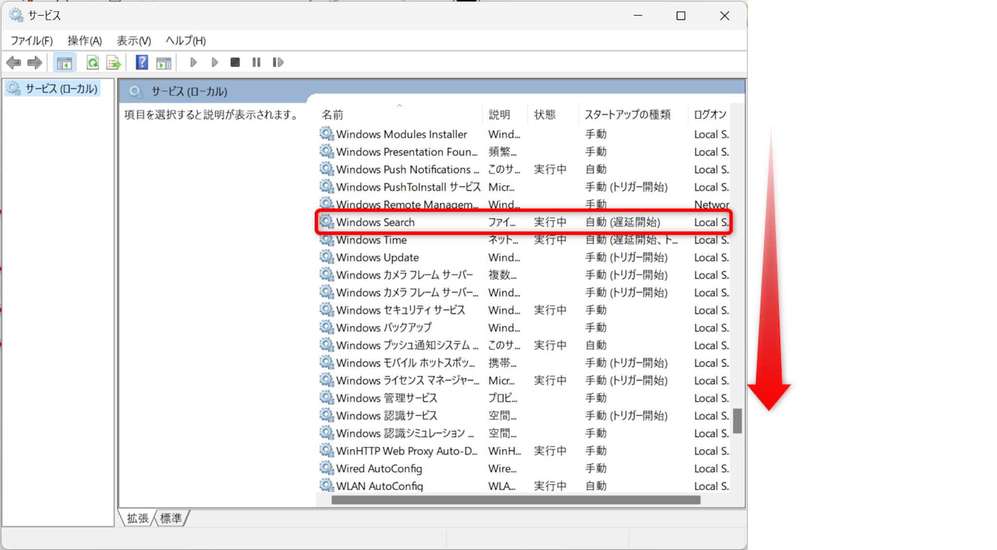 下にスクロールして「Windows Search」を探しましょう。