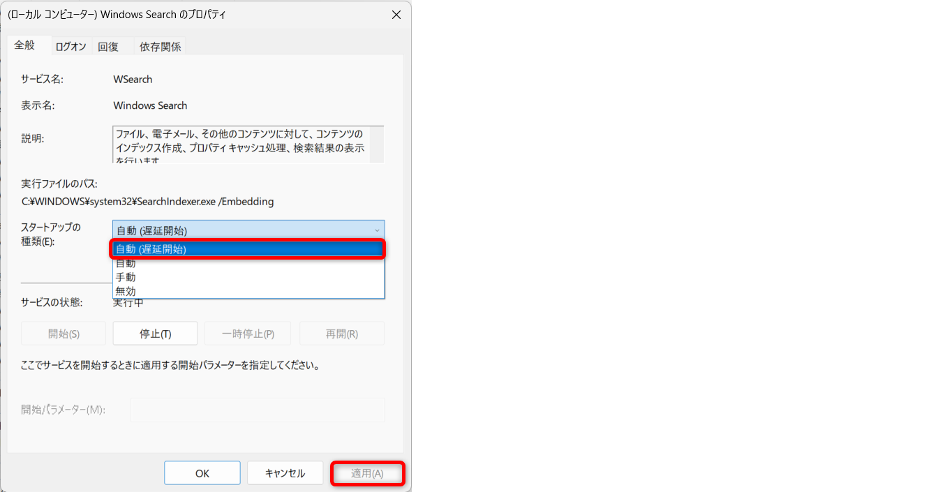 スタートアップの種類をクリックして、「自動(遅延開始)」を選択します。